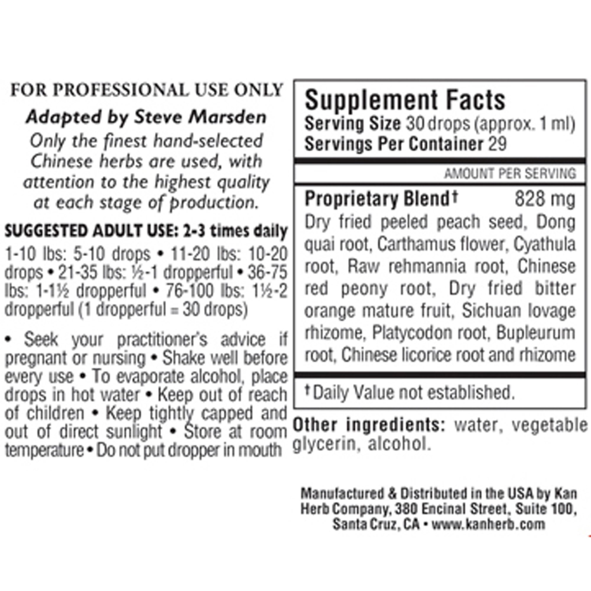 Peach seed, Dong quai root, Carthamus flower, Cyathula root, Raw rehmannia root, Chinese red peony root, Bitter orange mature fruit, Sichuan lovage rhizome, Platycodon root, Bupleurum root, Chinese licorice root.
