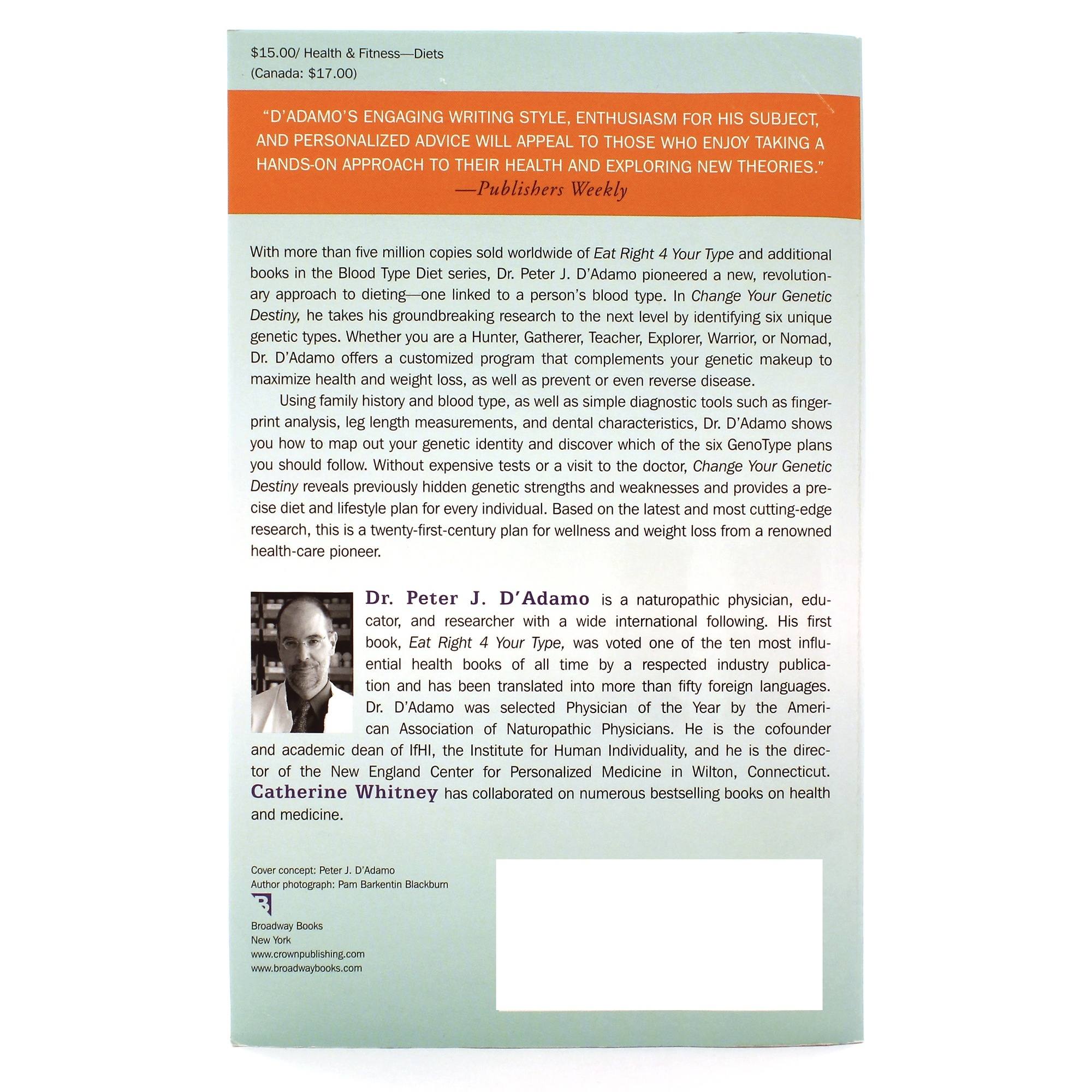 Dr. Peter J. DAdamo rocked the diet world more than ten years ago when he discovered that blood type was a determinant for the kind of food that would help maximize health and weight loss. Since then, Dr. DAdamo has used the new and exciting research from the human genome project to further refine his system of types.