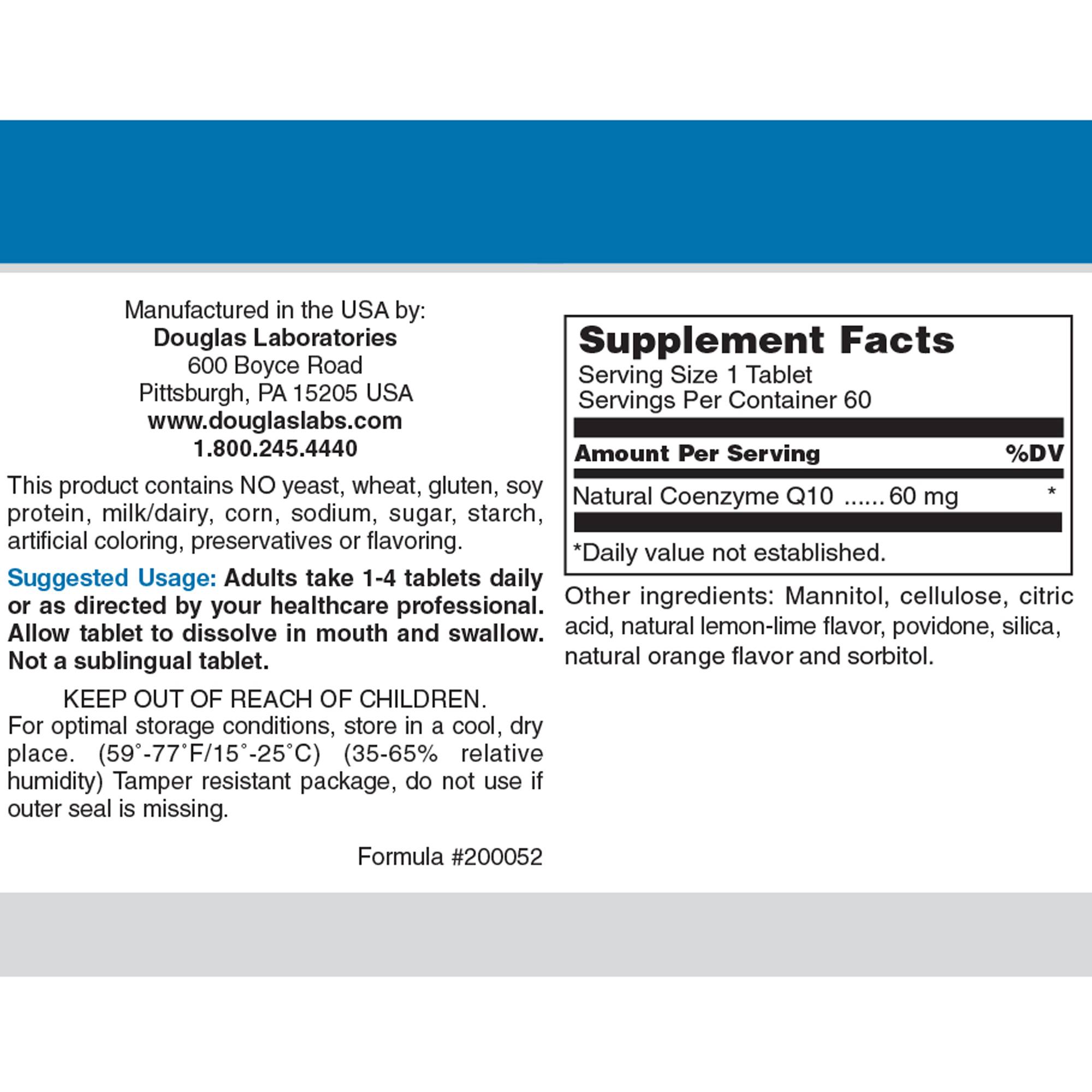 Citrus-Q10 60, provided by Douglas Laboratories, supplies naturally fermented coenzyme Q10 in a great tasting, natural citrus flavored chewable tablet. Citrus-Q10 60 contains no sugar, artificial colors or flavors and is suitable for vegetarians.