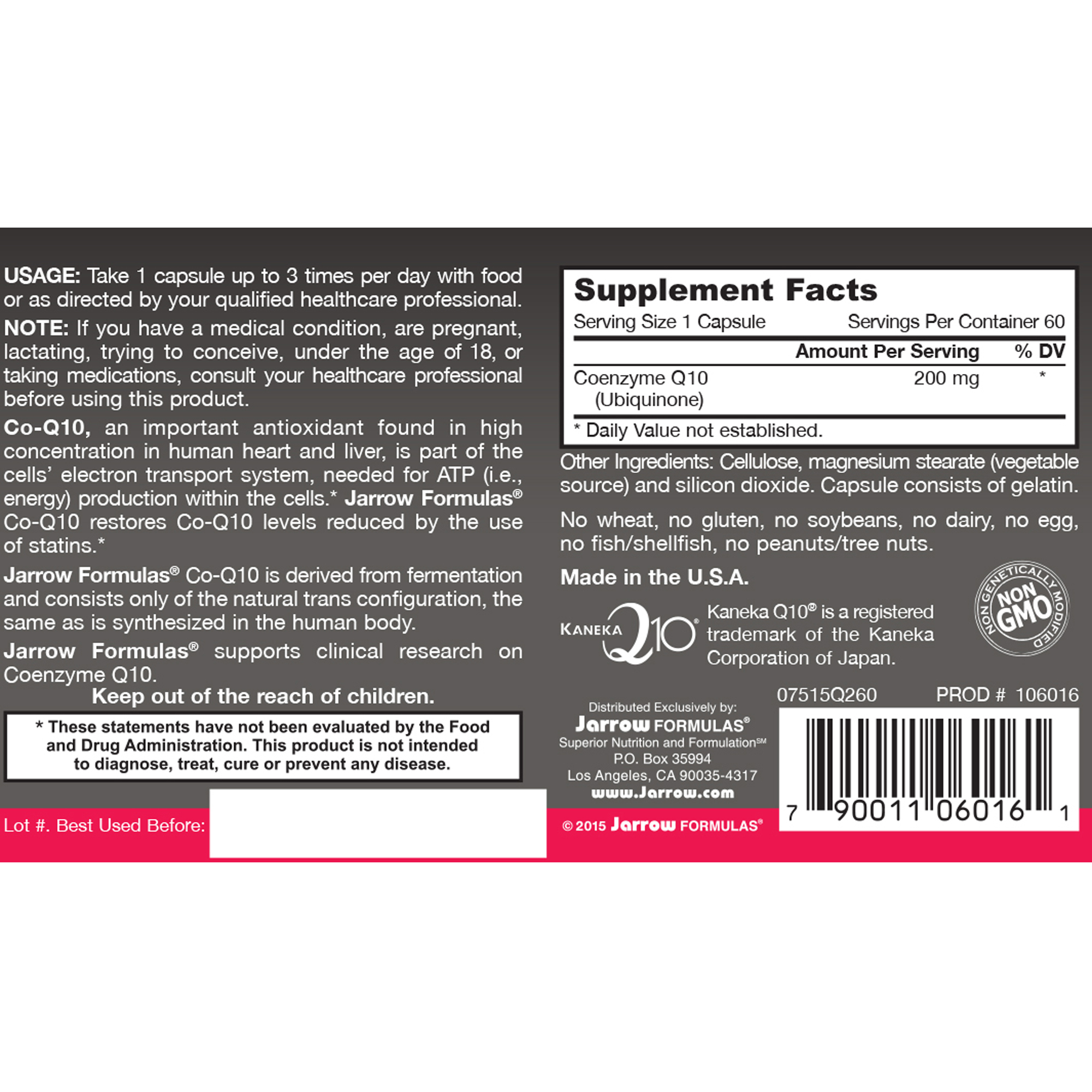 Jarrow Formulas® Co-Q10 is derived from fermentation and consists only of the natural trans configuration, the same as is synthesized in the human body.