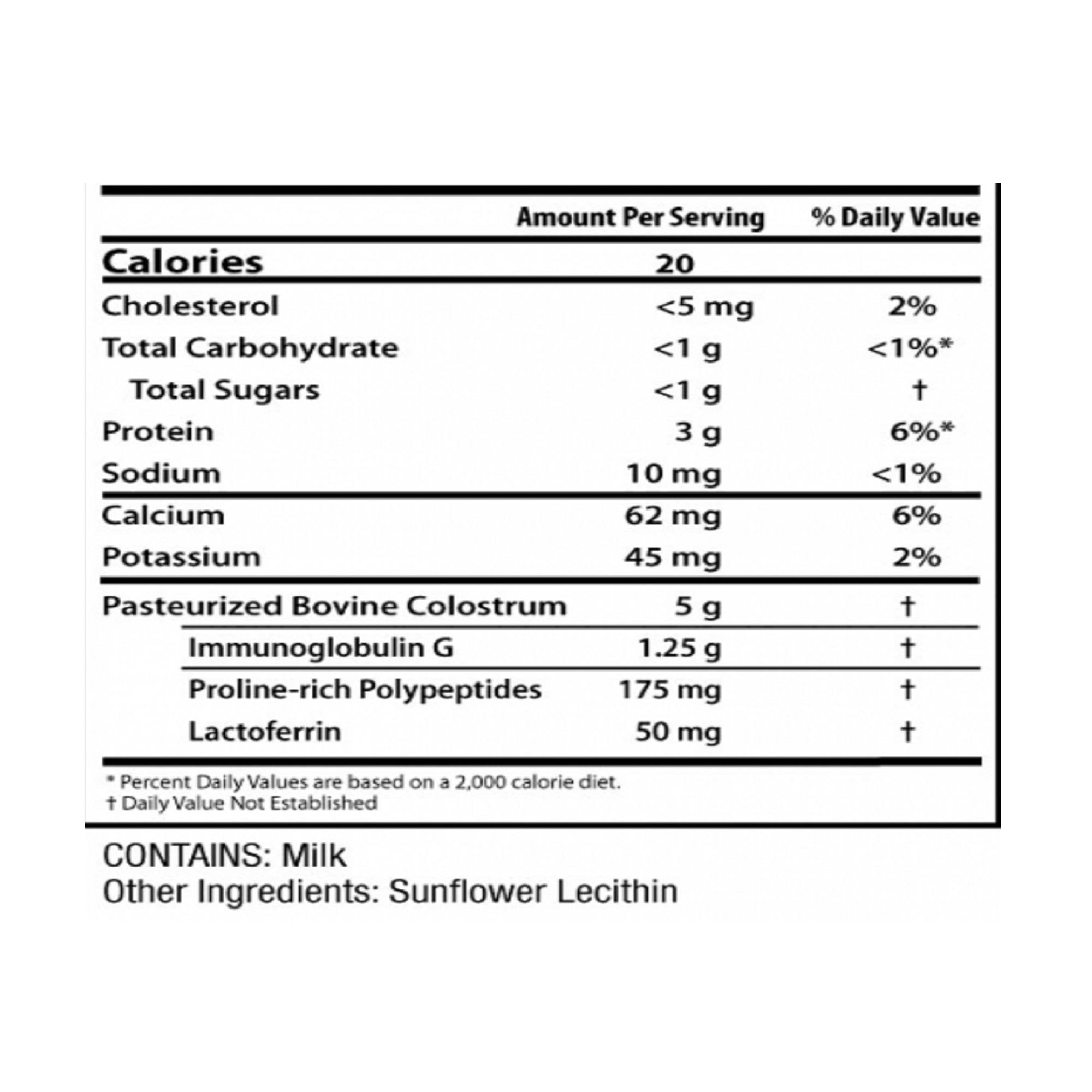 Colostrum-LD® contains first-milking bovine colostrum that has been flash-pasteurized, low heat-dried, and instantized for maximum safety, solubility, and efficacy. Proprietary liposomal delivery™ (LD) helps colostrum’s bioactive components transit through the digestive tract and are poised to have better absorption into the bloodstream. Colostrum-LD® is certified to contain a minimum of 25-30% immunoglobulins, 1.5% lactoferrin, 1.5% growth factors and 3.5-5% colostrum peptides (PRPs).