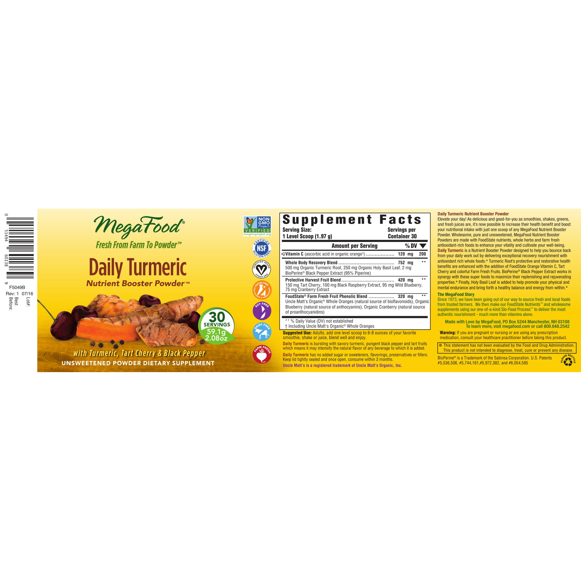 MegaFood is made with real food sourced from our trusted family farm partners, wholesome nutritional yeast, and added nutrients. Each vitamin or mineral is paired with an ideal whole food using our unique process to deliver guaranteed potency and the benefit of health-promoting compounds present in the whole food itself.