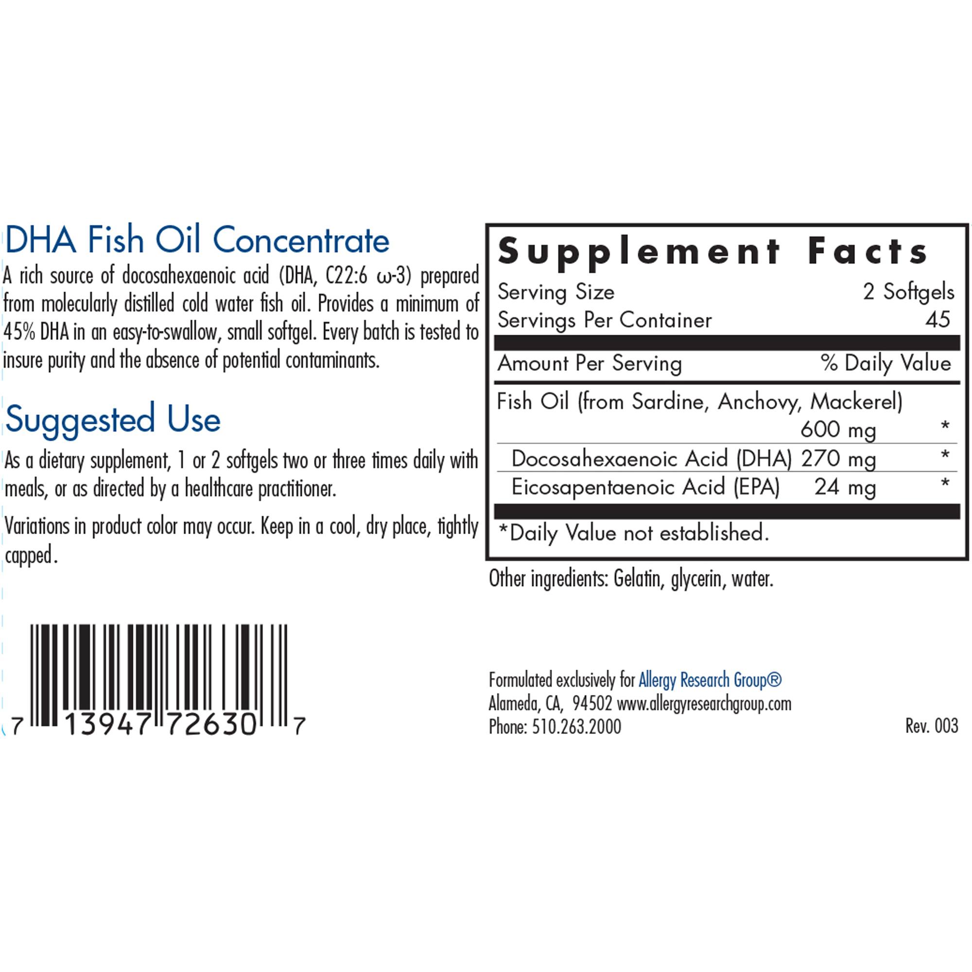 Supplies docosahexaenoic acid (DHA, C22:6 ω-3) prepared from molecularly distilled cold water fish oil. DHA is an omega-3 fatty acid that supports cell membrane function, particularly in the retina and the brain. The product provides a minimum of 45% DHA in an easy-to-swallow, small capsule.