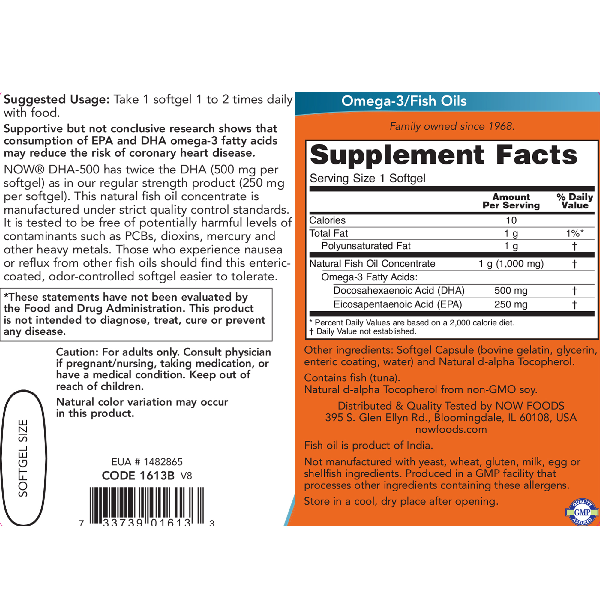 NOW® DHA-500 has twice the DHA (500 mg per softgel) as in our regular strength product (250 mg per softgel). This natural fish oil concentrate is manufactured under strict quality control standards. It is tested to be free of potentially harmful levels of contaminants such as PCBs, dioxins, mercury and other heavy metals. Those who experience nausea or reflux from other fish oils should find this entericcoated, odor-controlled softgel easier to tolerate.