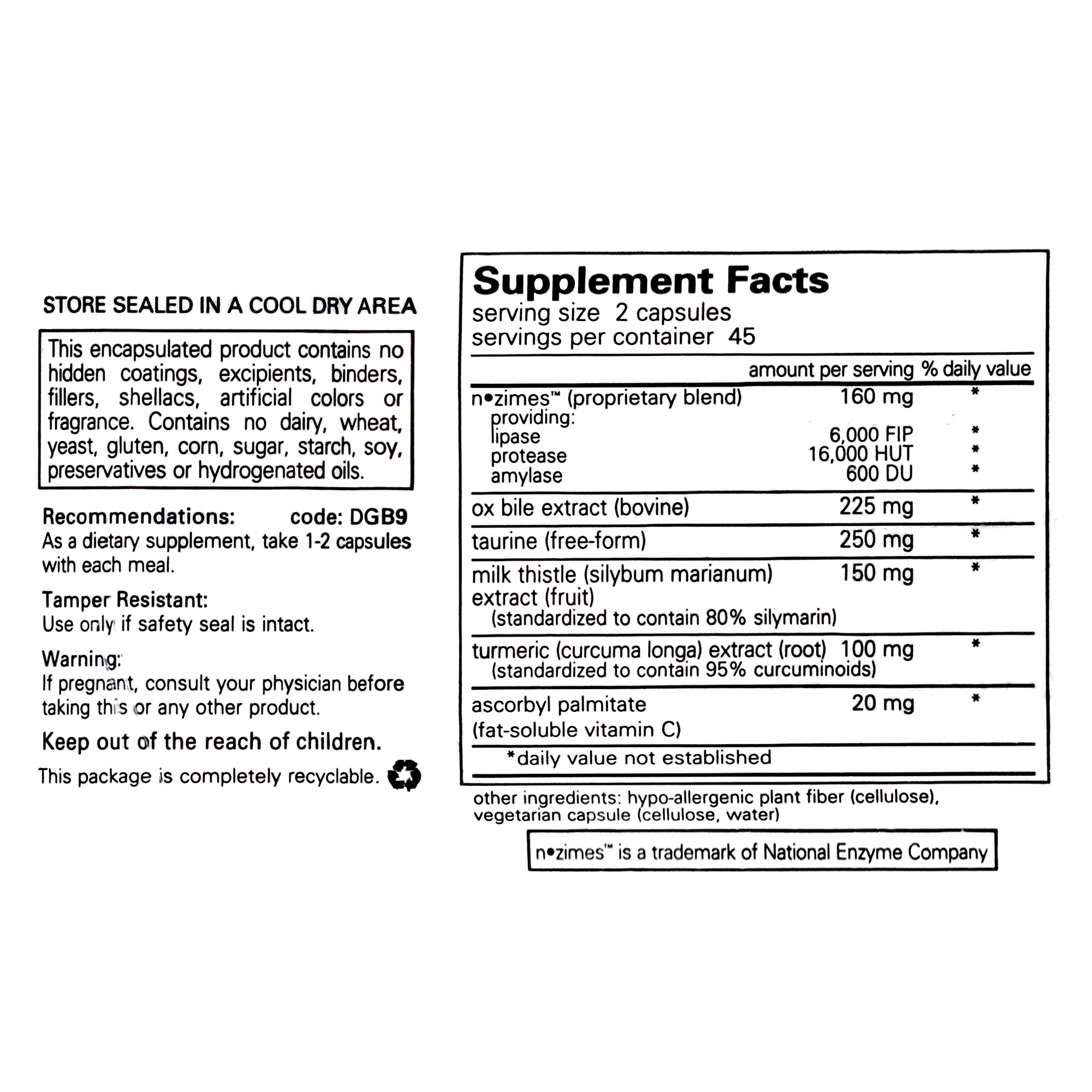 Digestion GB contains digestive enzymes, bile salts, taurine and herbal extracts to promote healthy gall bladder function and fat utilization. The metabolism of fats involves emulsification and digestion in a complex process that requires healthy liver, gallbladder and pancreas function. Milk thistle, curcumin and taurine promote liver and gallbladder health and stimulate production and secretion of bile acids. Bile acids, also provided in the form of ox bile salts, support the emulsification of fats necessary for digestion. The digestive enzymes included in this formula are active in a broad pH range to support fat, carbohydrate and protein digestion to complement pancreatic enzyme activity. This formula has enhanced lipase for extra fat digestion support.