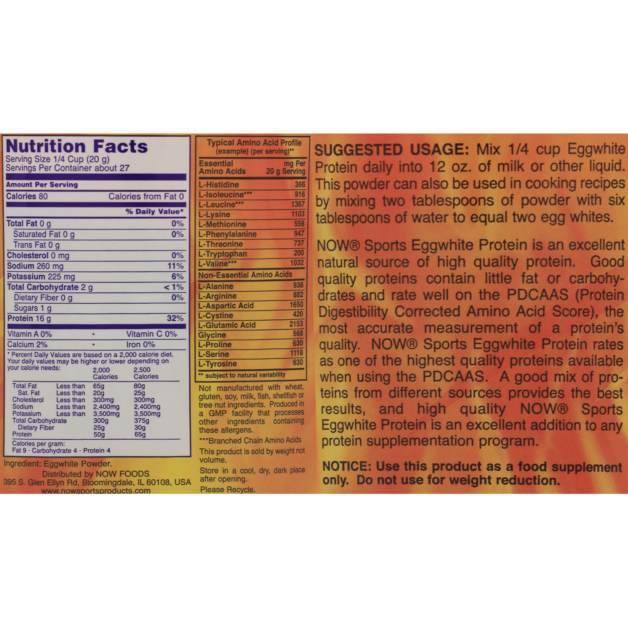 Eggwhite Protein from NOW is an excellent natural source of high quality protein. Good quality proteins contain virtually no fat or carbohydrates and rate well on the PDCAAS (Protein Digestibility Corrected Amino Acid Score), the newest and most accurate measurement of a proteins quality. NOW® Eggwhite Protein contains.