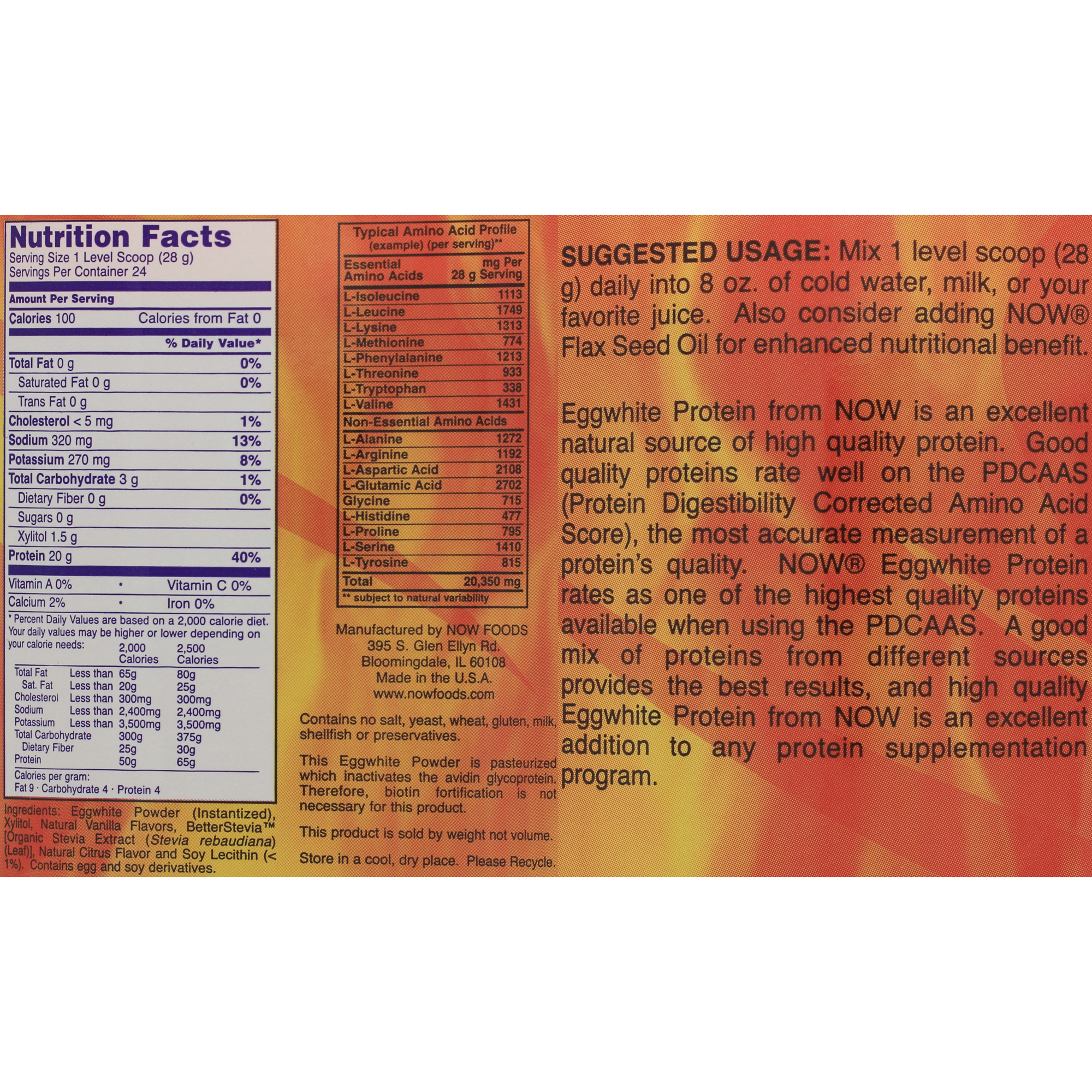 Eggwhite Protein from NOW is an excellent natural source of high quality protein. Good quality proteins rate well on the PDCAAS (Protein Digestibility Corrected Amino Acid Score), the most accurate measurement of a proteins quality. NOW® Eggwhite Protein rates as one of the highest quality proteins available when using the PDCAAS. A good mix of proteins from different sources provides the best results, and high quality Eggwhite Protein from NOW is an excellent addition to any protein supplementation program.