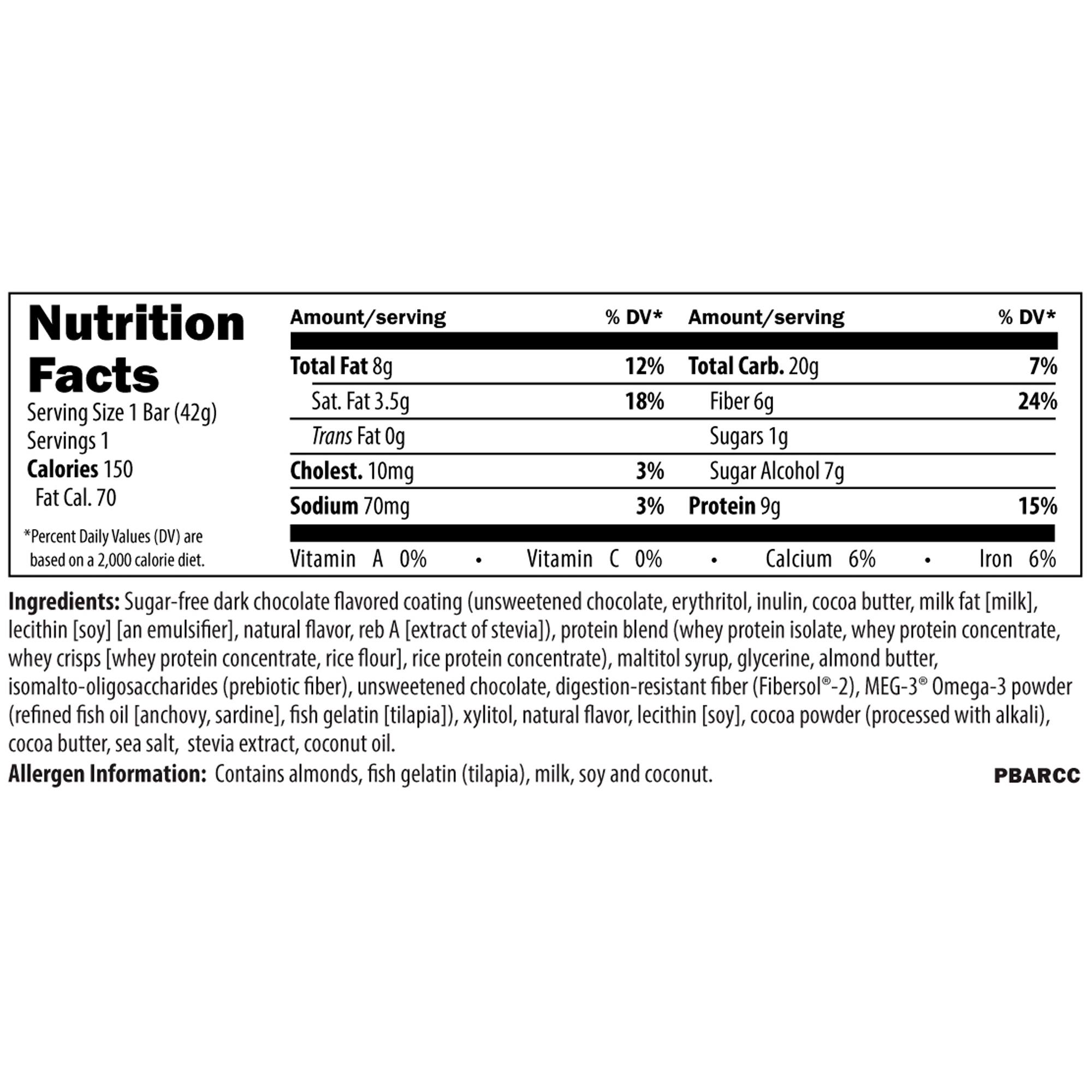 Other Ingredients: Protein blend (whey protein isolate, whey protein concentrate, whey crisps [whey protein concentrate, rice flour], rice protein concentrate), unsweetened chocolate, maltitiol syrup, glycerine, almond butter, inulin, cocoa butter, erythritol, soluble fiber (from tapioca starch), digestion resistant fiber, omega 3 powder (refined fish oil [anchovy, sardine], fish gelatin (tilapia), xylitol, natural flavor, natural cocoa powder, stevia extract, sea salt, natural vanilla extract, coconut oil.