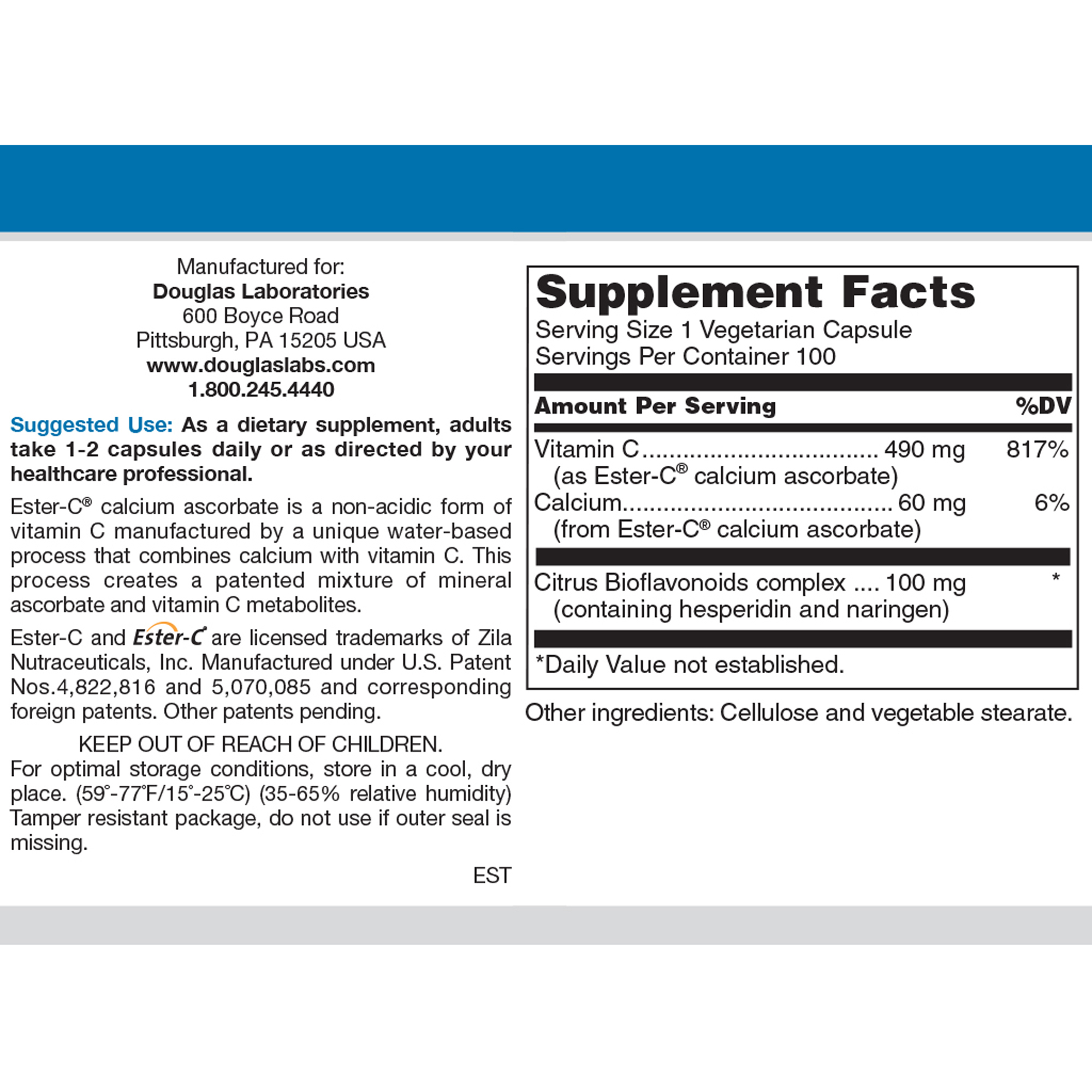 Ester-C Complex capsules, provided by Douglas Laboratories, contain a non-acidic, calcium ascorbate form of vitamin C combined with a citrus bioflavonoid complex. Ester-C is a unique form of vitamin C that is created through a patented, water-based process that combines vitamin C and calcium. Ester-C is non-acidic and should be well-tolerated by those who are sensitive to the acidic nature of ascorbic acid.