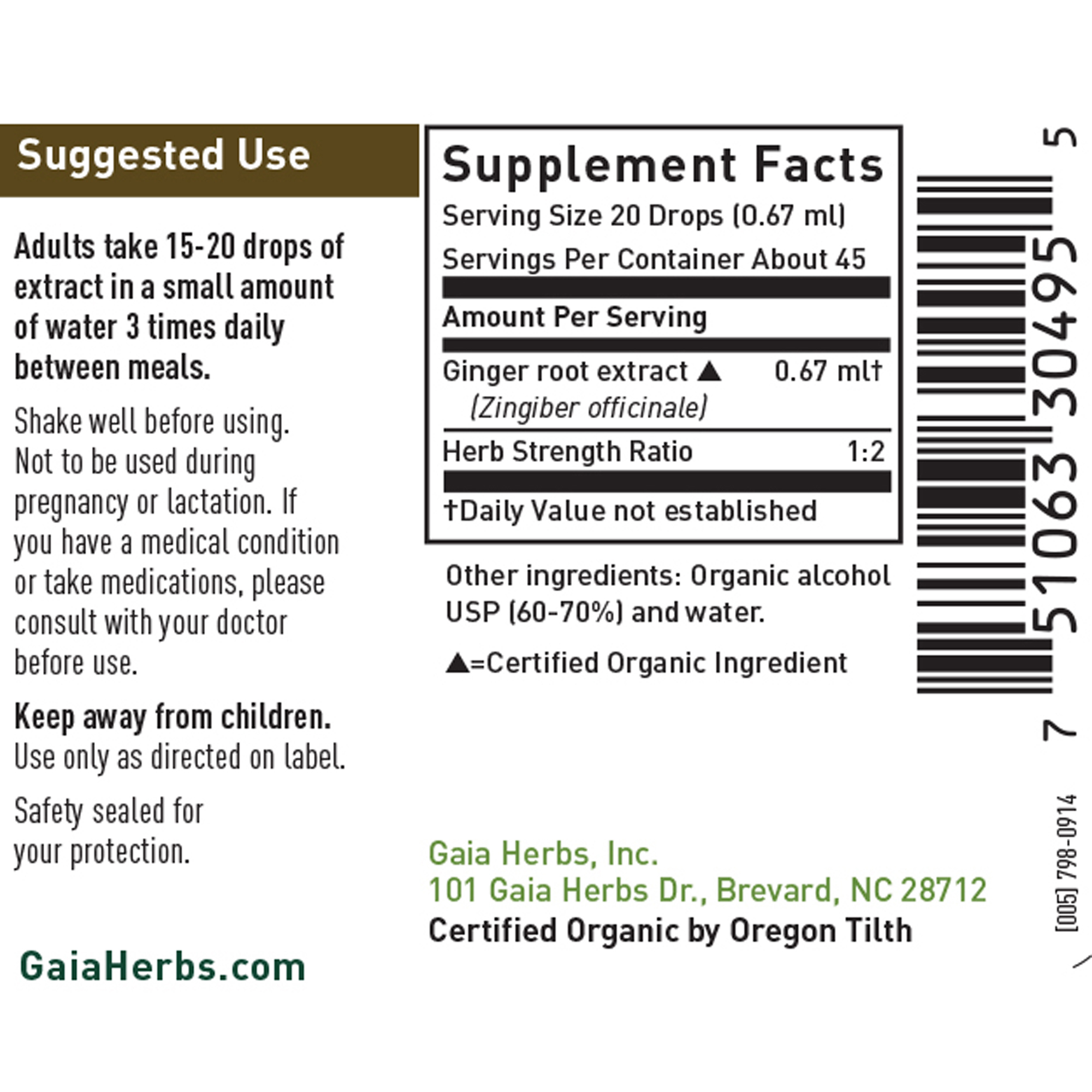 Organic Ginger root (Zingiber officinale) in Pure Gtrain Alcoho; USP (60-70%) and Water.