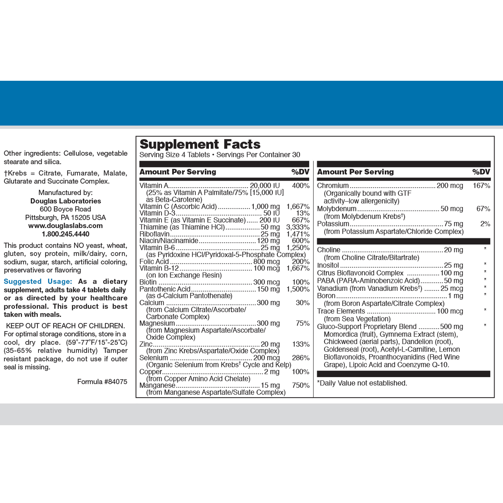 FUNCTIONS Studies show that a high percentage of adults in North America and other developed countries eat less than the minimum daily allowance of 10 or more essential nutrients. Adequate amounts and proper balance of these nutrients are needed not only for maintaining good health, but also for the dietary management of the body’s structure as well as the optimum functioning of its various systems, including the immune system. The GlucoSupport Formula™ has been carefully developed to contain the right proportions of vitamins, minerals, trace elements, and other nutrients without danger of toxic build-up or other side effects. Each ingredient is selected in consideration of its absorbability, competitive relationship with other nutrients, allergenic potential, and longterm safety. Certain nutrients such as beta-carotene, vitamin C, vitamin E and B-complex vitamins are included in high-potency amounts because of the vital roles they play in antioxidant protection, energy production, the maintenance of healthy blood cells, the nervous system, hormonal balance, and more. Minerals and trace elements are provided in their safest and most bioavailable forms. Gluco-Support Formula contains not only the base formula of Douglas Laboratories Ultra-Specific Nutrition 2000 Series that offers intensive support for the healthy functioning of the body in general, but also a blend of herbs and additional nutrients specifically formulated to offer additional support of the body’s mechanisms that maintain healthy glucose metabolism. Glucose metabolism that is associated with abnormally high blood glucose can lead to high levels of glycation. Glycation is the non-enzymatic attachment of sugars to major molecules in the body, including proteins, lipids, and nucleic acids. Glycation reactions generate advanced glycation end-products (AGEs) and glycotoxin intermediates. AGEs cause abnormal and destructive functioning of body proteins, lipids, and nucleic acids. AGE-associated damage is suspected in the pathogenesis of many diseases and age-related deteriorations. There are three primary routes by which nutritional components can help prevent AGE formation. Maintenance of normal blood glucose levels is fundamental to preventing AGE formation. Chromium is an integral component of the glucose tolerance factor (GTF), a naturally occurring compound of chromium, nicotinic acid, and amino acids that is essential for proper glucose metabolism. Adequate chromium nutrition is essential for the formation of GTF and subsequent control of blood glucose levels. Gymnema sylvestre is an Ayurvedic botanical that may assist in the normal regeneration and repair of healthy pancreatic beta cells. Gymnema is also suspected of reducing intestinal glucose absorption. Biotin serves as a cofactor of glucose metabolism and induces glucokinase, an enzyme that encourages cells to retain glucose for energy production rather than release it into the blood stream. Alpha-lipoic acid appears to enhance glucose use by muscles by augmenting muscle protein content.
