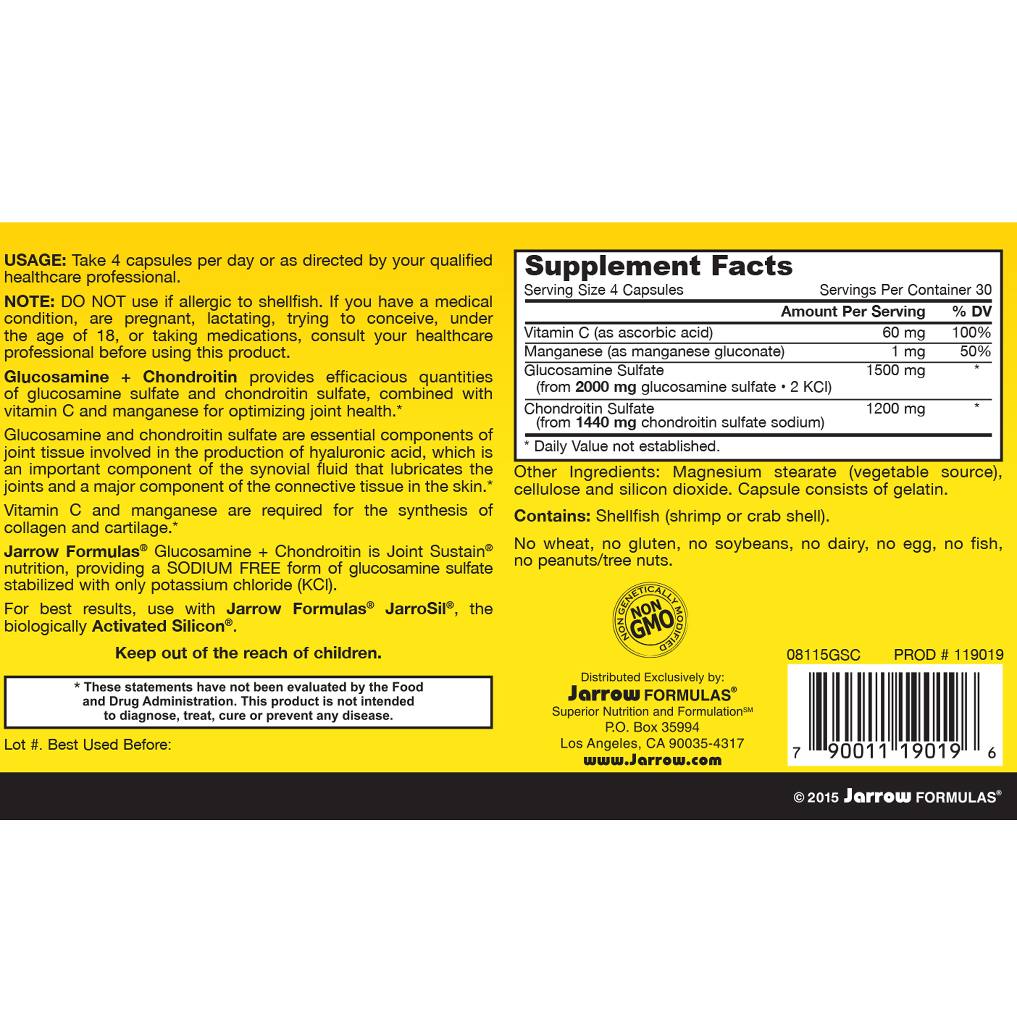 Jarrow Formulas® Glucosamine + Chondroitin Combination is Joint Sustain® nutrition, providing a SODIUM FREE form of GS stabilized with only potassium chloride (KCl).