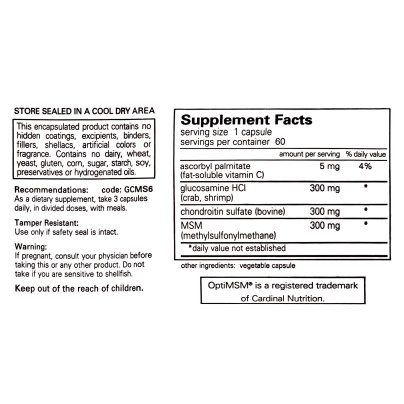 Sulfur-containing methylsulfonylmethane (MSM) is included in this glucosamine and chondroitin combination to provide an enhanced spectrum of nutrients for optimal cartilage matrix composition, connective tissue strength, and joint comfort. Glucosamine promotes the synthesis of the glycosaminoglycan chondroitin sulfate. Chondroitin sulfate is responsible for building the ground substance of cartilage, molecules known as proteoglycans. In addition, chondroitin sulfate may maintain healthy enzyme activity. An important role of sulfur from MSM is to enhance the structure and integrity of proteoglycans.*
