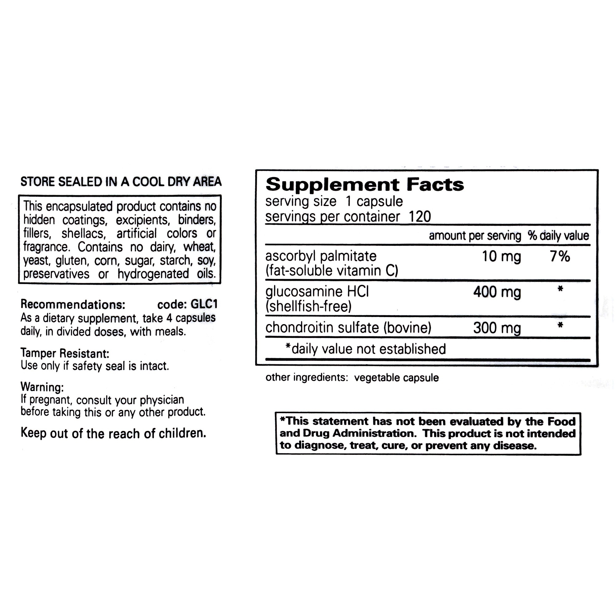 Shellfish-fee glucosamine HCl and chondroitin sulfate are combined to provide a basic joint support formula.