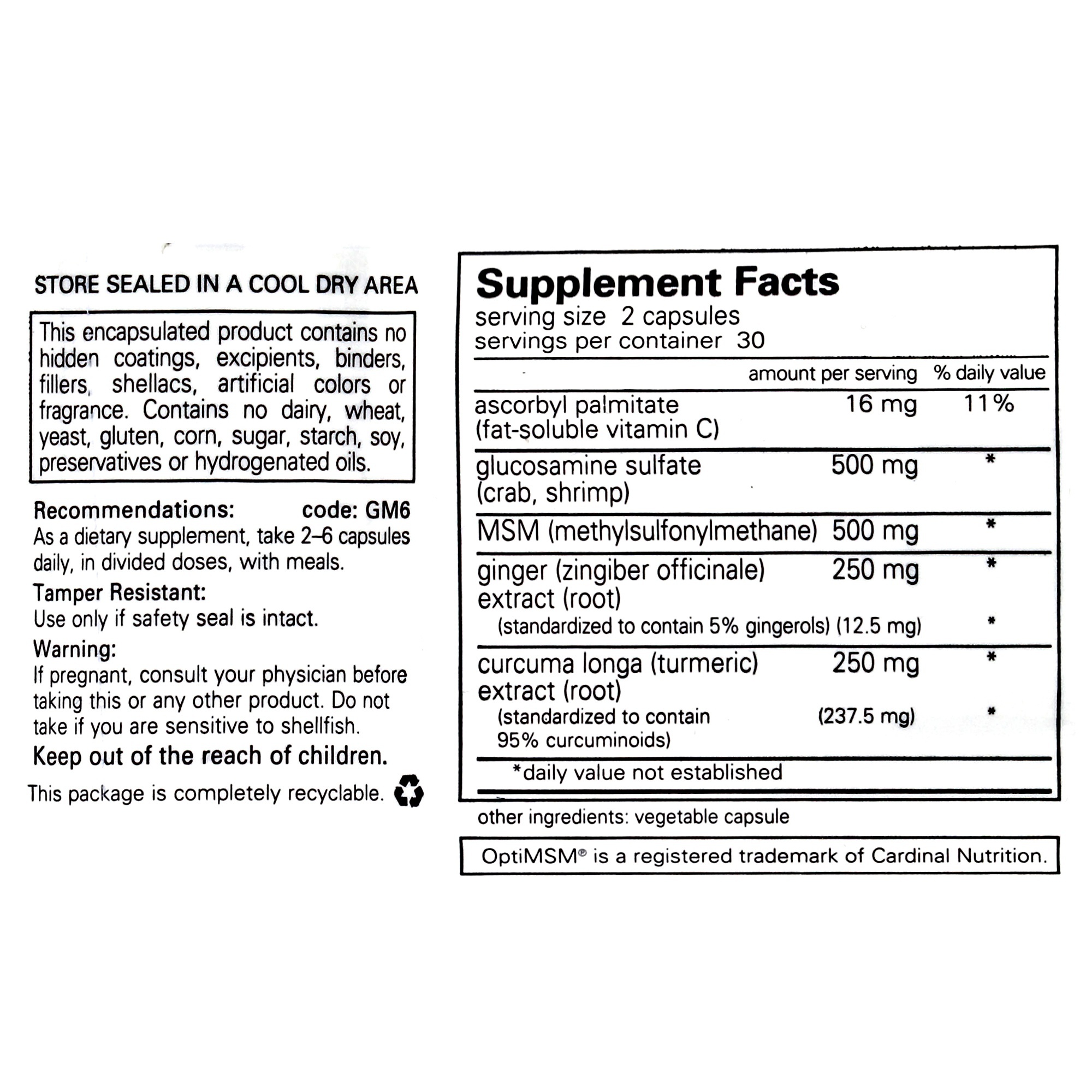 *Glucosamine sulfate and MSM provide intrinsic compounds essential for healthy cartilage formation, including glycosaminoglycans and elemental sulfur, respectively. MSM has also been attributed with enhancing healthy immune cell activity, thereby supporting tissues surrounding the joints. These important cartilage matrix constituents are complemented with additional factors for supporting a healthy immune response. In studies, ginger promotes healthy prostaglandin and leukotriene biosynthesis. Curcumin helps maintain healthy neutrophil function and scavenges free radicals such as nitric oxide.