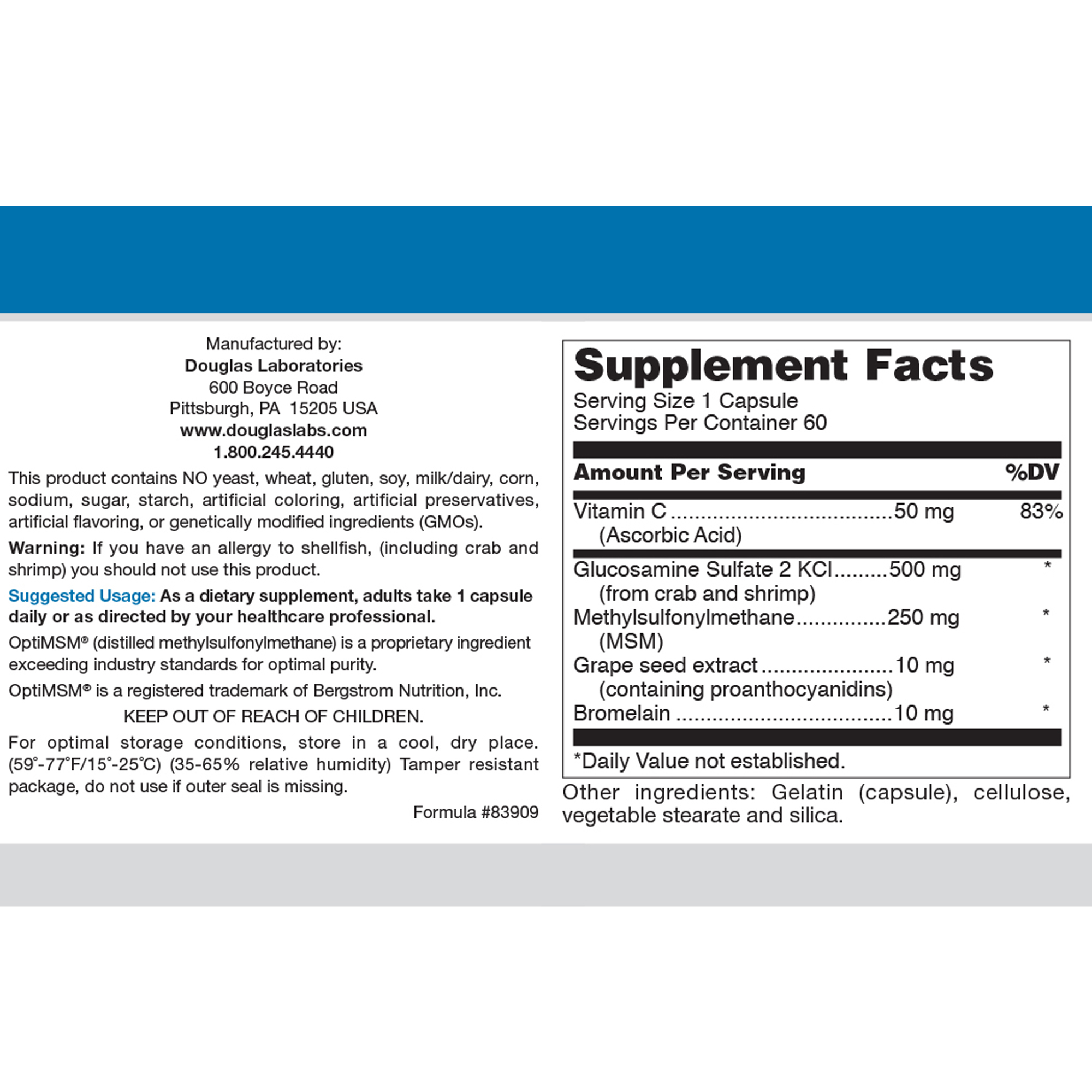 Glucosamine + MSM Forte capsules provided by Douglas Laboratories contain 500 mg of pure glucosamine sulfate and 250 mg of methylsulfonylmethane (MSM). Ascorbic acid, proanthocyanidins, and bromelain are also included to provide additional aid in maintaining the health of aging joints.