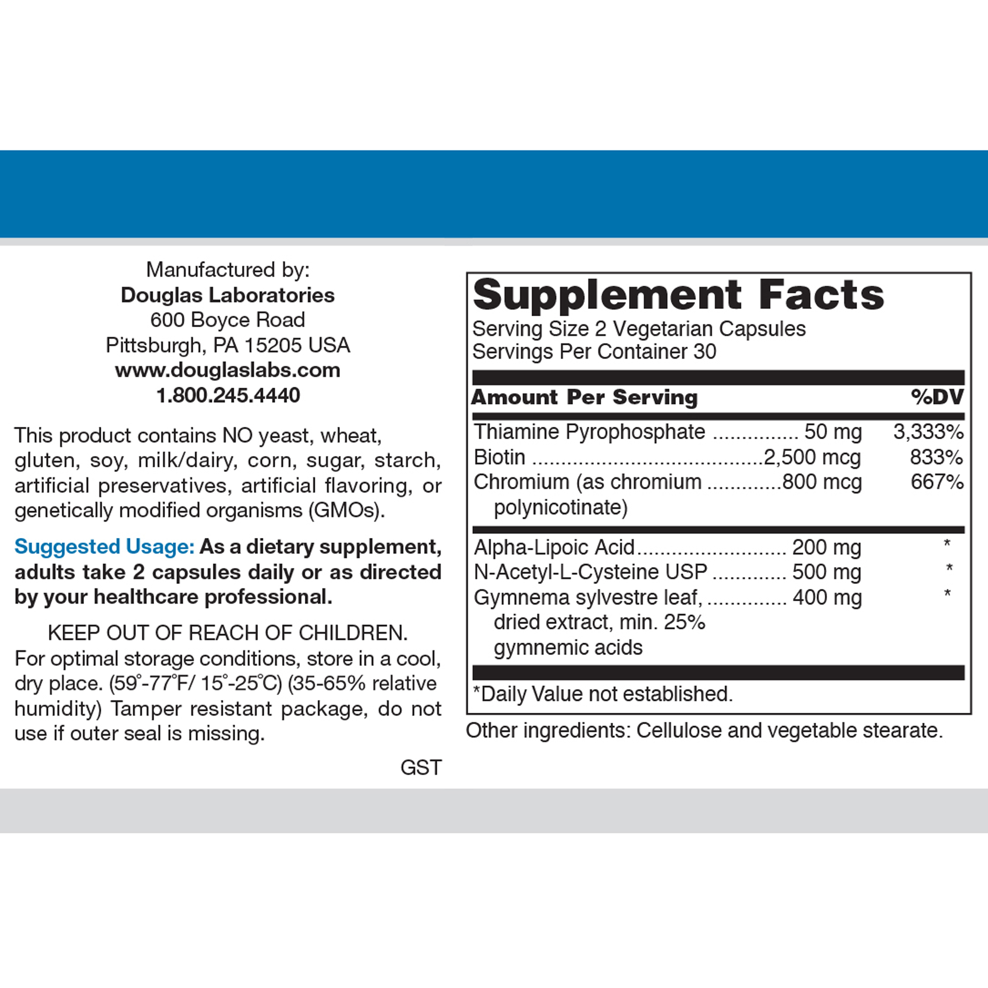 Glucoset capsules, provided by Douglas Laboratories, contain a complementary blend of thiamin, biotin, chromium, alpha-lipoic acid, N-acetyl-L-cysteine, and standardized extract of Gymnema sylvestre leaf for targeted nutritional support of glucose metabolism.