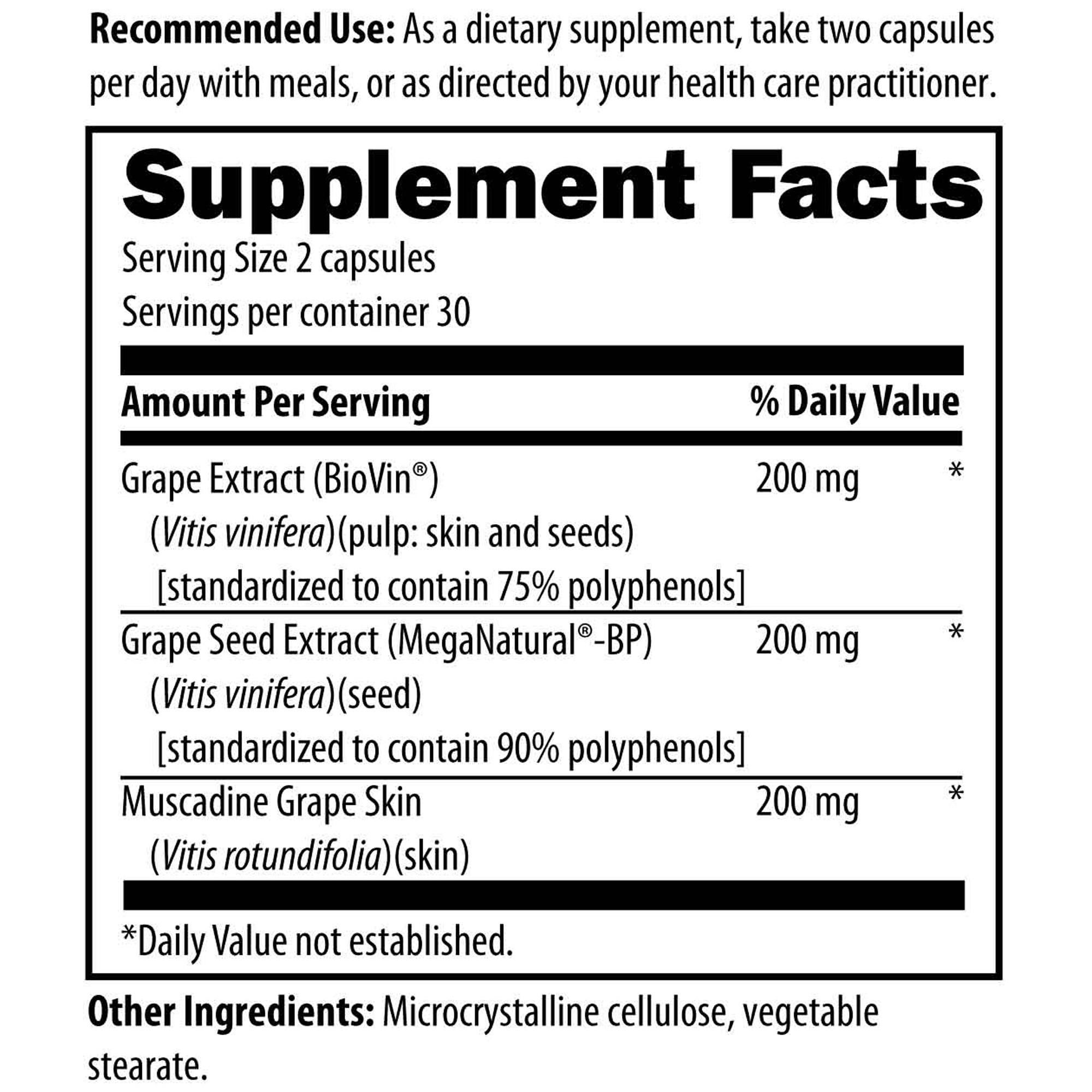 This is a truly exciting and powerful product containing generous amounts of a wide variety of polyphenols and proanthocyanins including resveratrol. The ingredients were sourced based on the best available research for grape-derived ingredients, including human clinical trials. Grape Seed Supreme™ contains protective nutrients with promising benefits for the cardiovascular system, skin and brain.