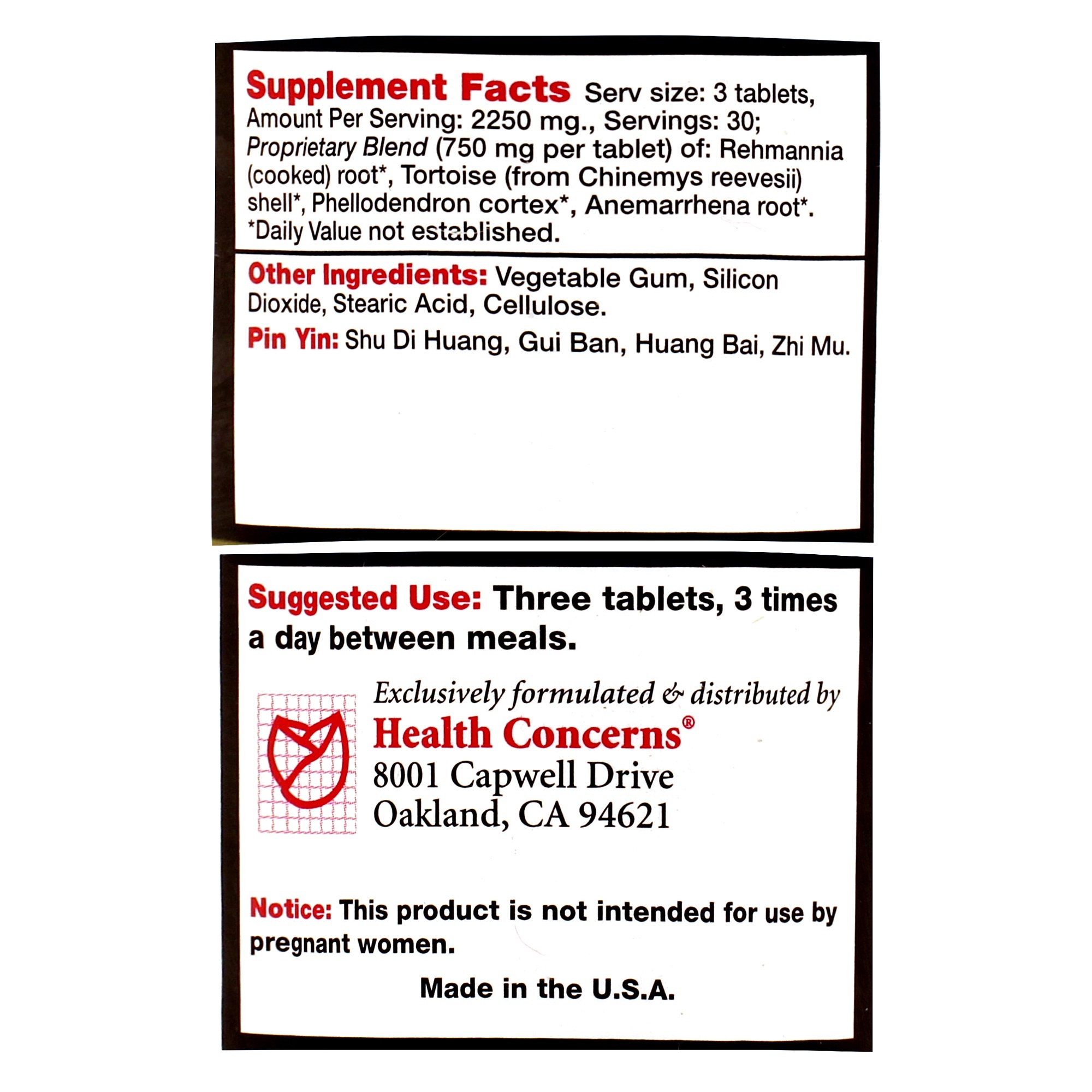 Great Yin is based on the formula Da Bu Yin. The main ingredient is rehmannia root (shu di huang) a sweet, bitter and cold herb that nourishes yin and produces fluids and clears heat. It is used traditionally in many formulas to strengthen kidney yin and for bleeding problems such as hematuria, epistaxis and uterine bleeding. Cultivated tortoise shell (gui ban) is a salty, sweet and neutral herb that replenishes yin as well as subdues liver yang and nourishes the kidney. Traditionally this herb is used for tidal fevers, night sweats, uterine bleeding and dry mouth and throat. Health Concerns uses cultivated tortoise shell from Chinemys reevesii species. Phellodendron cortex (huang bai) is a bitter and cold herb that eliminates damp heat, subdues fire and clears heat caused by yin deficiency. Anemarrhena root (zhi mu) is a bitter, cold herb that purges fire in the lung and stomach and replenishes yin. It has been traditionally used for tuberculosis, chronic low fevers and back pain.