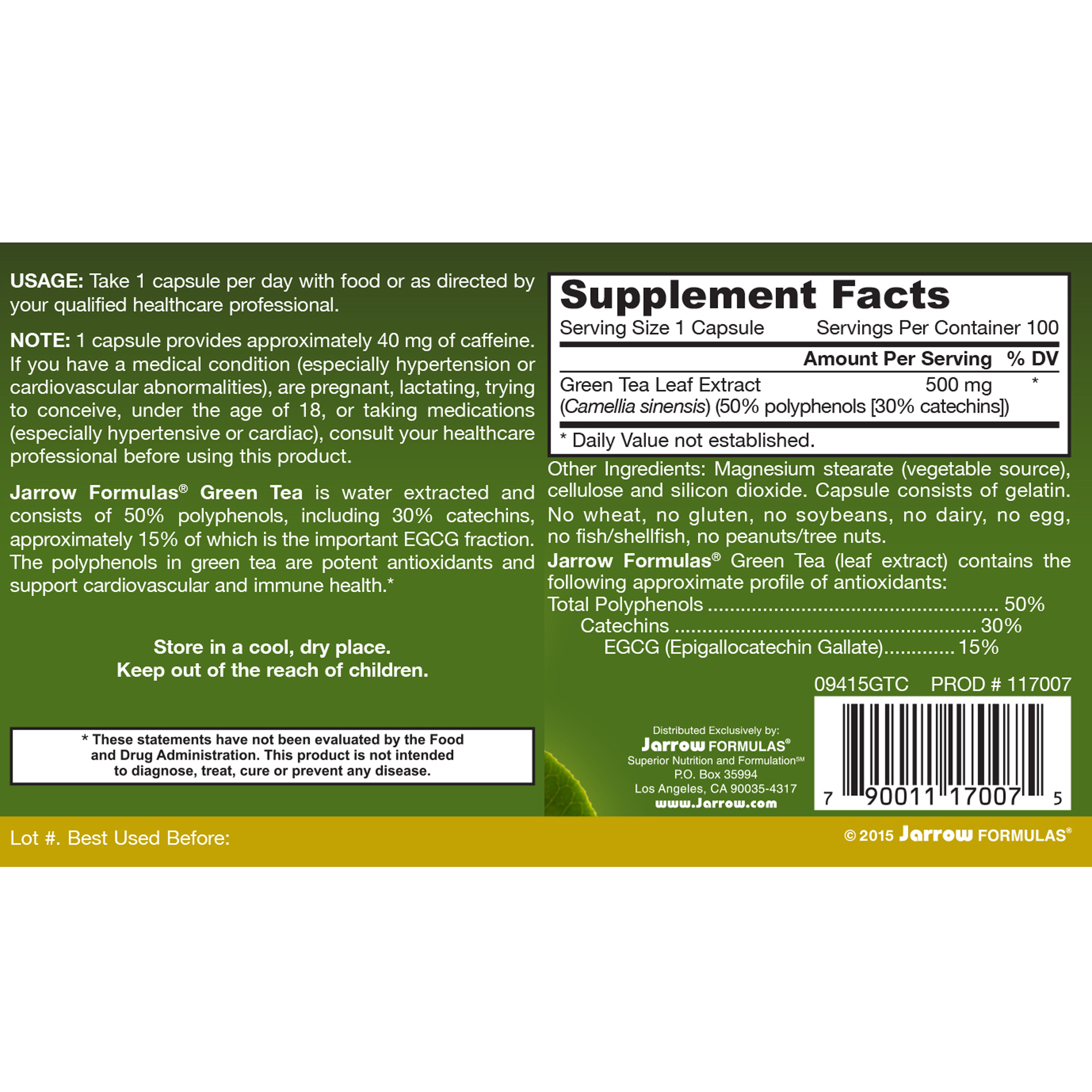 Jarrow Formulas Green Tea is water extracted and consists of 50% polyphenols, including 30% catechins, approximately 15% of which is the important EGCG fraction. The polyphenols in green tea are potent antioxidants and support cardiovascular and immune health.*