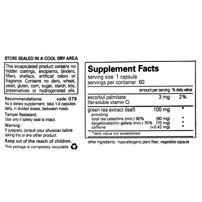 * This decaffeinated green tea extract is a 100:1 herbal extract containing catechins, a class of powerful antioxidant compounds known as polyphenols. It contains a minimum of 90% catechins, with epigallocatechin gallate, the most powerful catechin, making up a minimum of 70% of the content.