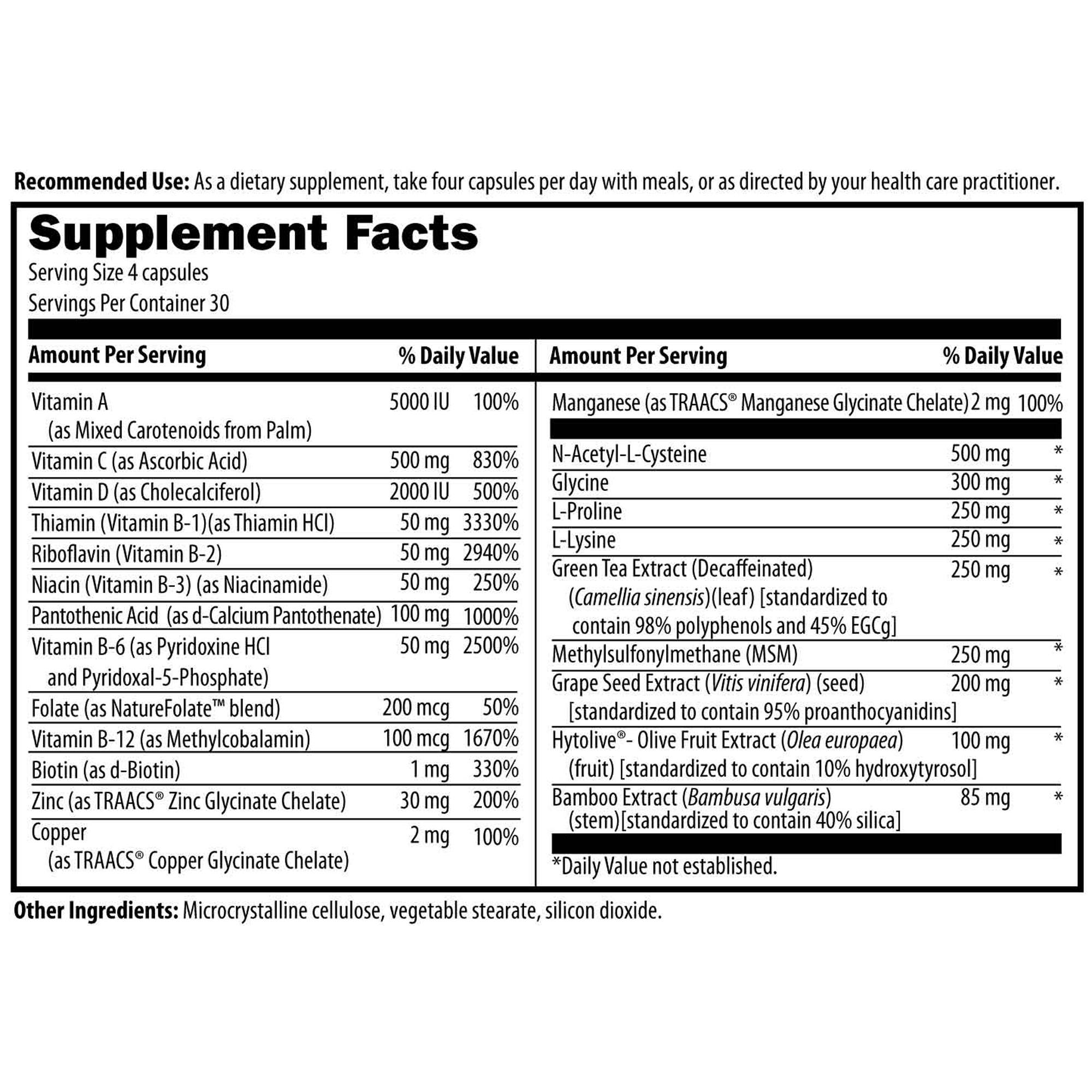 As a dietary supplement, take four capsules per day with meals, or as directed by your health care practitioner.