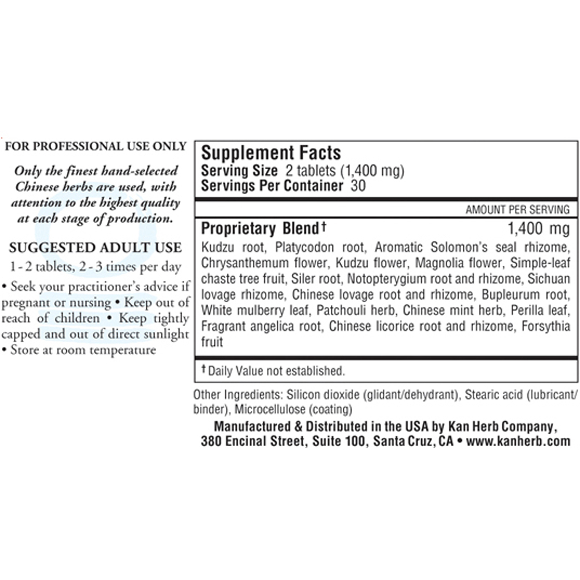 Kudzu root, Platycodon root, Aromatic solomons seal rhizome, Yellow chrysanthemum flower, Kudzu flower, Magnolia flower, Simple-leaf chaste tree fruit, Siler root, Notopterygium root & rhizome, Sichuan lovage rhizome, Chinese lovage root, Bupleurum root, White mulberry leaf, Chinese giant hyssop herb, Chinese mint herb, Perilla leaf, Fragrant angelica root, Chinese licorice root, Forsythia fruit