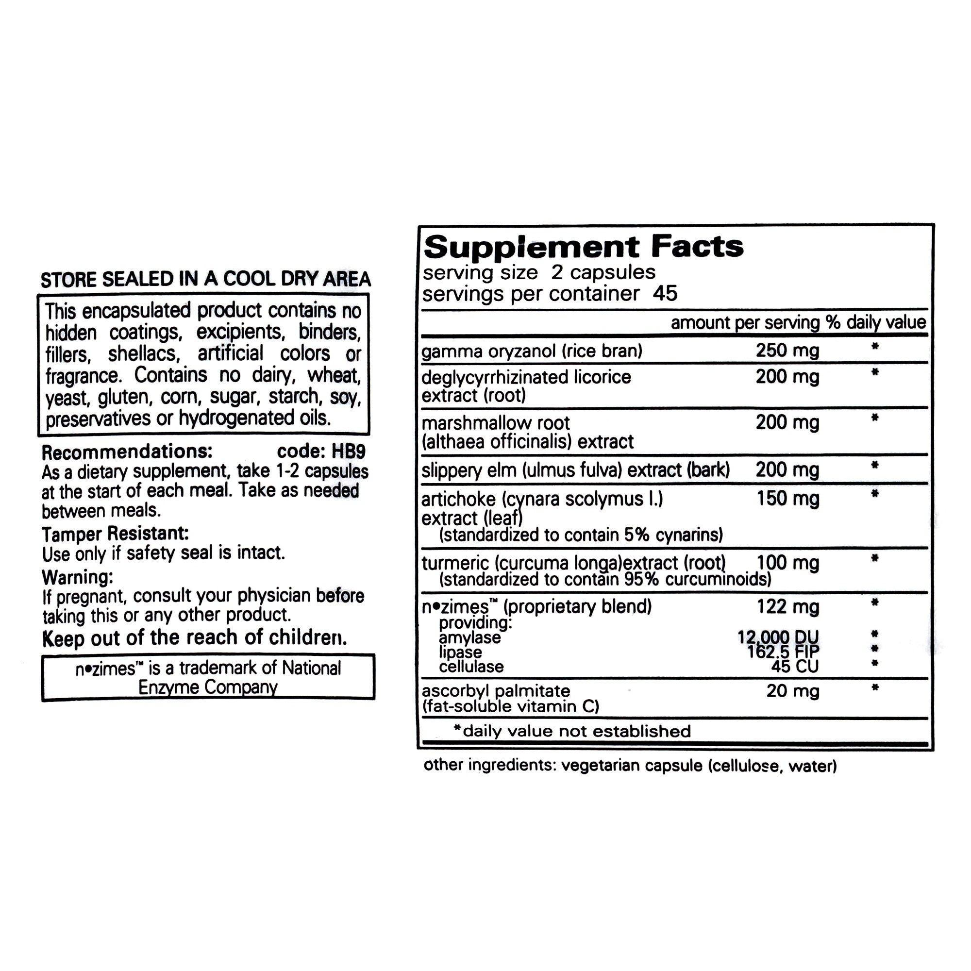 * For years, gamma oryzanol has been associated with maintaining healthy gastric secretion, even under occasionally stressful conditions. It is likely that gamma oryzanol does this by influencing the autonomic nervous system. DGL, marshmallow and slippery elm provide traditional support for soothing the gastrointestinal tract and promoting the integrity of the mucosal lining. Artichoke helps to stimulate the digestive process and has been shown to relieve occurrences of occasional heartburn while turmeric may offer relief from occasional gas and indigestion. Plant enzymes further promote digestive function for overall comfort and relief of occasional gas, bloating and heartburn.