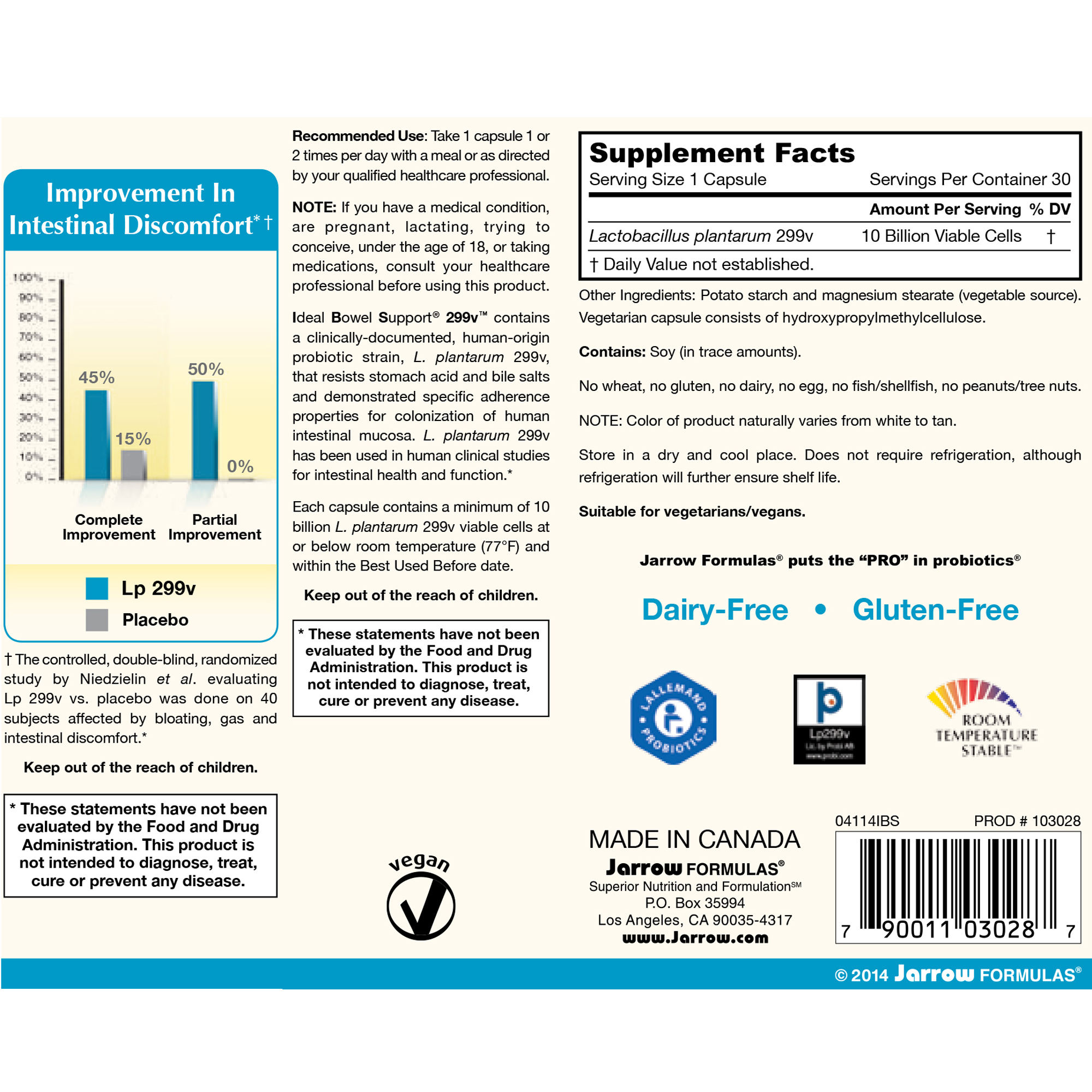 Ideal Bowel Support® 299v™ contains a clinically-documented, human-origin probiotic strain, L. plantarum 299v, that resists stomach acid and bile salts and demonstrated specific adherence properties for colonization of human intestinal mucosa. L. plantarum 299v has been used in human clinical studies for intestinal health and function.*