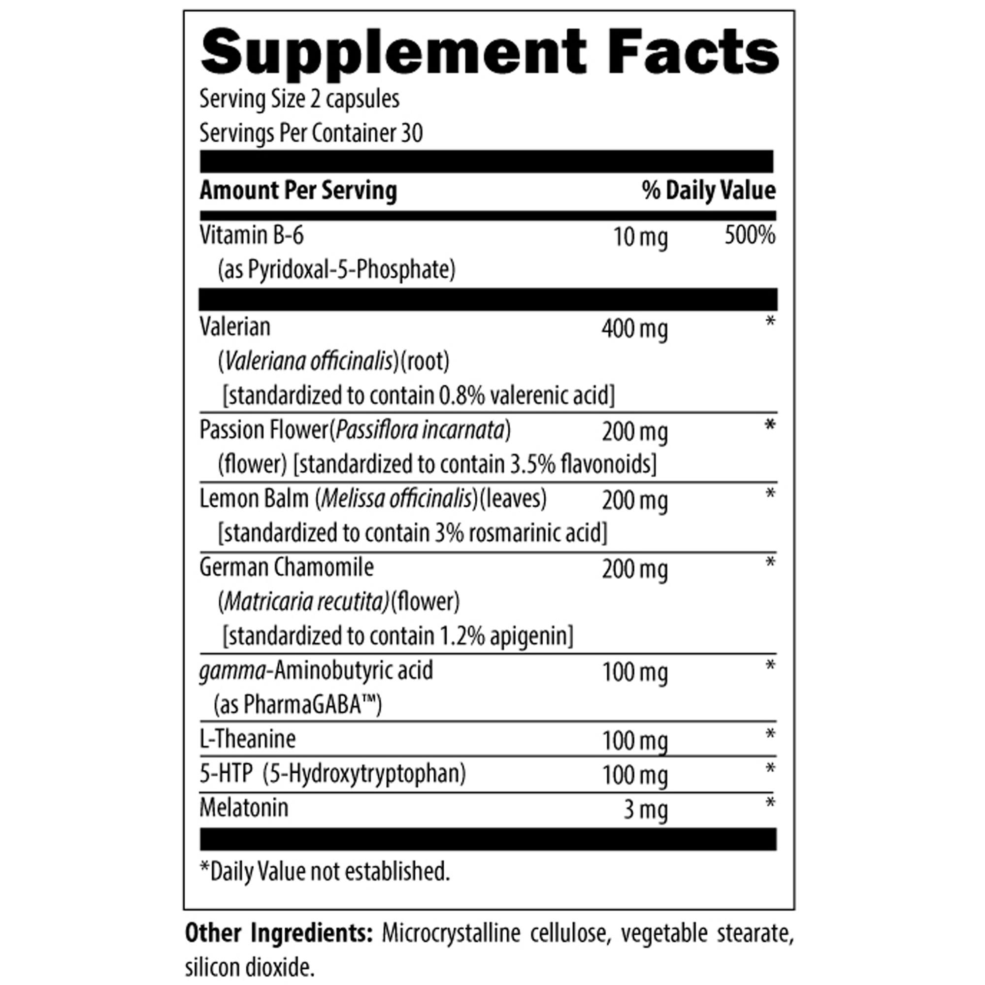 Key ingredients include botanicals that support nervous system function, PharmaGABA™ (a proprietary form of GABA), L-theanine, melatonin, 5-HTP, and pyridoxal-5-phospate (activated form of vitamin B6).