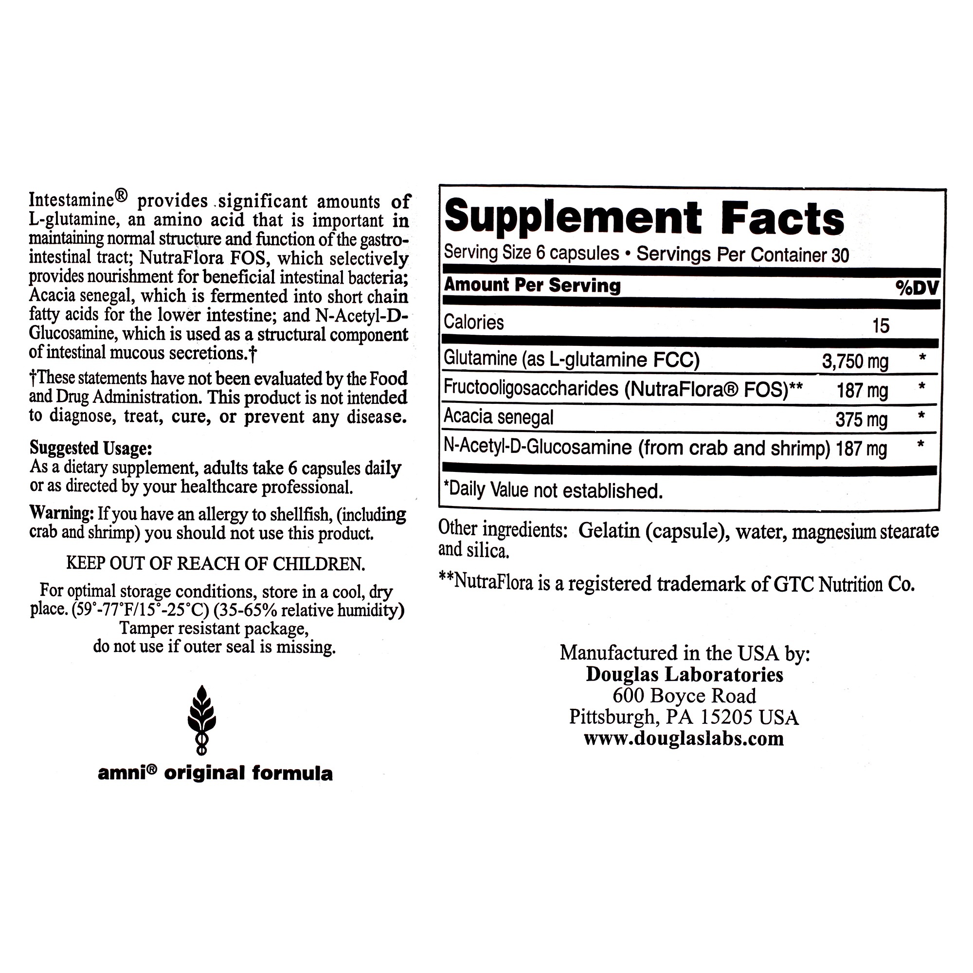 Intestamine capsules, supplied by Douglas Laboratories, is a unique and convenient dietary supplement formula for gastrointestinal support. Intestamine provides significant amounts of L-glutamine, an amino acid that is important in maintaining normal structure and function of the gastrointestinal tract; NutraFlora FOS, which selectively provides nourishment for beneficial intestinal bacteria; acacia fiber, which is fermented into short chain fatty acids for the lower intestine; and N-Acetyl-D-Glucosamine, which is used as a structural component of intestinal mucous secretions.†