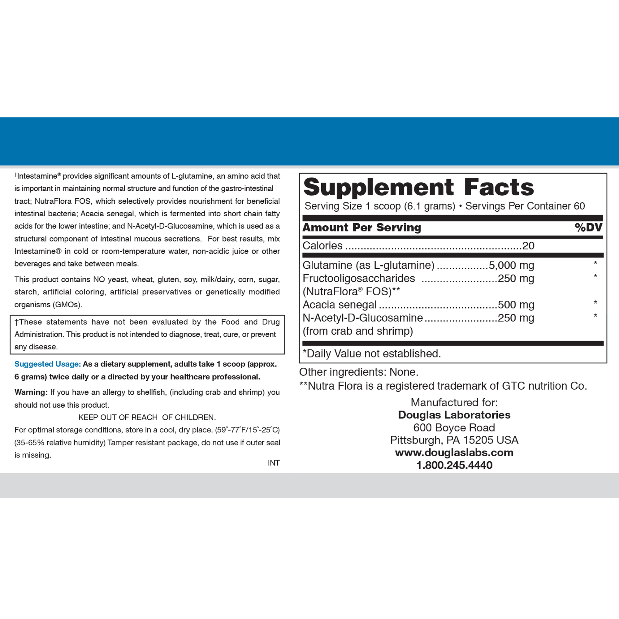 Intestamine® powder is a unique and convenient dietary supplement formula for gastrointestinal support.† Intestamine provides significant amounts of L-glutamine, an amino acid that is important in maintaining normal structure and function of the gastrointestinal tract; NutraFlora®FOS, which selectively provides nourishment for beneficial intestinal bacteria; acacia fiber, which is fermented into short chain fatty acids for the lower intestine; and N-acetyl-d-glucosamine, which is used as a structural component of intestinal mucous secretions.† Intestamine is a taste-neutral powder that mixes easily with juices and other beverages.