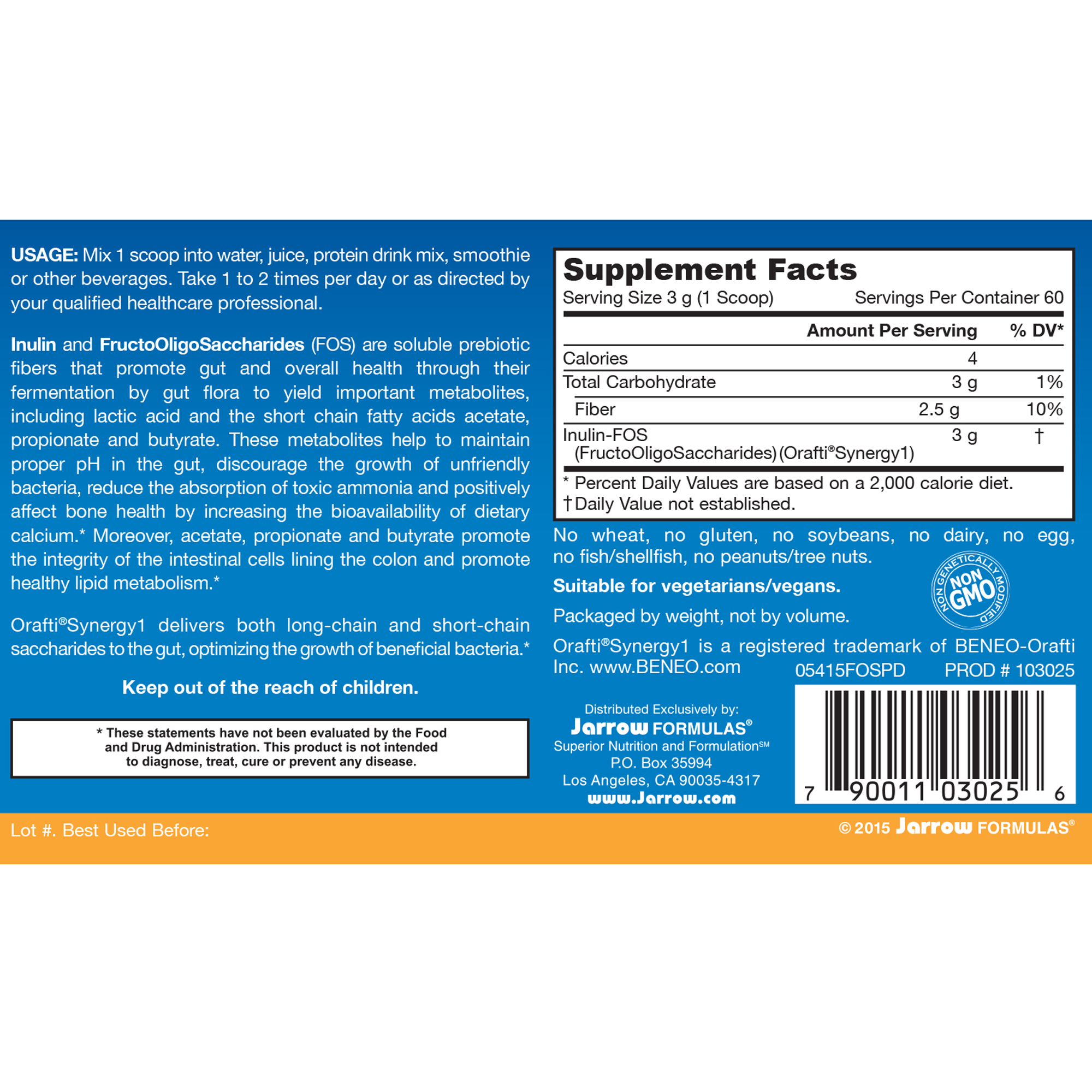 Inulin and FructoOligoSaccharides (FOS) are soluble prebiotic fibers that promote gut and overall health through their fermentation by gut flora to yield important metabolites, including lactic acid and the short chain fatty acids acetate, propionate and butyrate. These metabolites help to maintain proper pH in the gut, discourage the growth of unfriendly bacteria and increase the solubility of dietary calcium.* Moreover, acetate, propionate and butyrate promote the integrity of the intestinal cells lining the colon and may promote healthy lipid metabolism.*