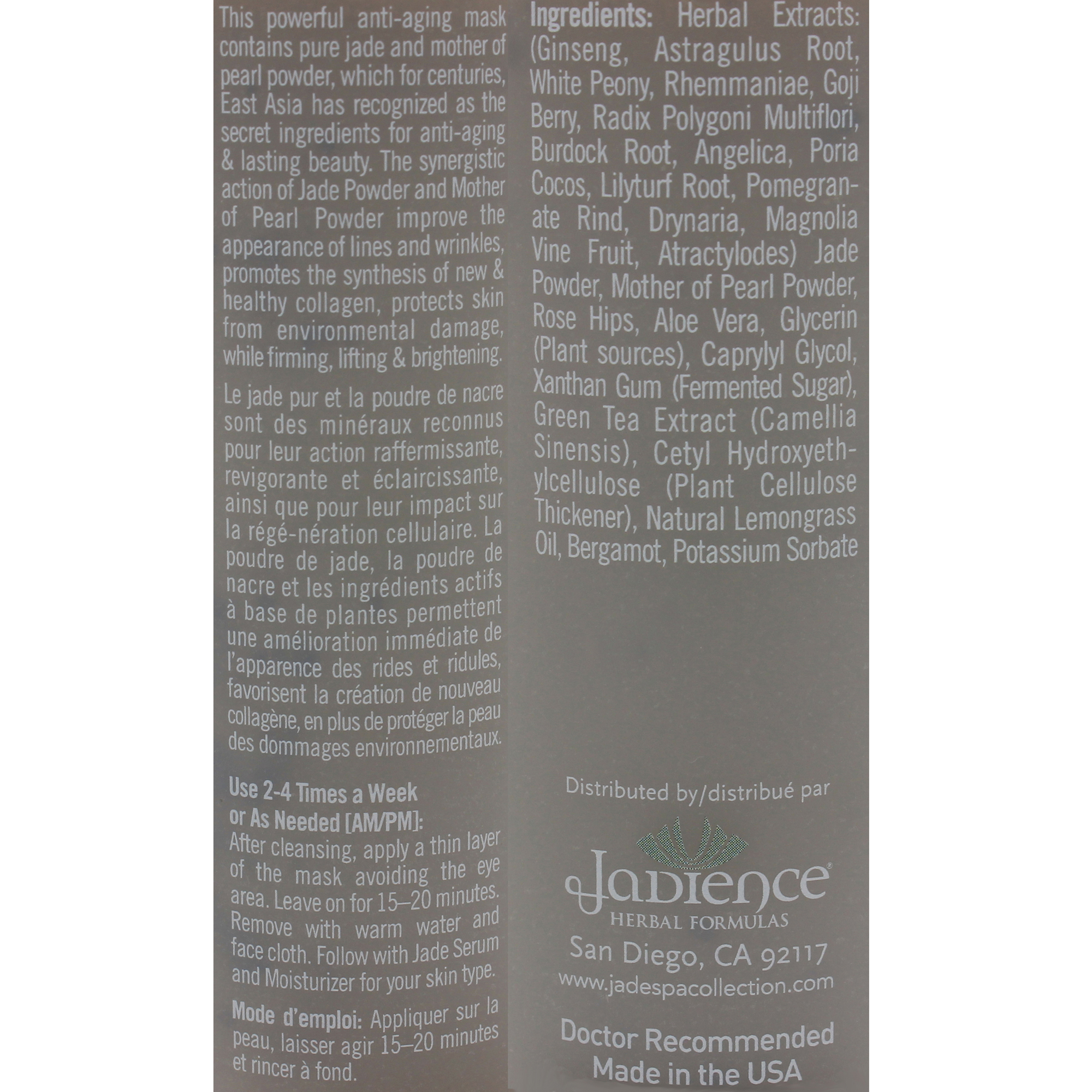 This powerful anti-aging gel mask contains pure jade and mother of pearl powder, which are powerful minerals known to firm, lift, brighten, and stimulate cell regeneration. For centuries, East Asia has recognized the jade stone and mother of pearl as the secret ingredients for anti-aging and lasting beauty. The synergistic action of Jade Powder, Mother of Pearl Powder, Hyaluronic Acid and active herbal ingredients immediately improves the appearance of lines and wrinkles, promotes the synthesis of new and healthy collagen, and protects skin from environmental damage