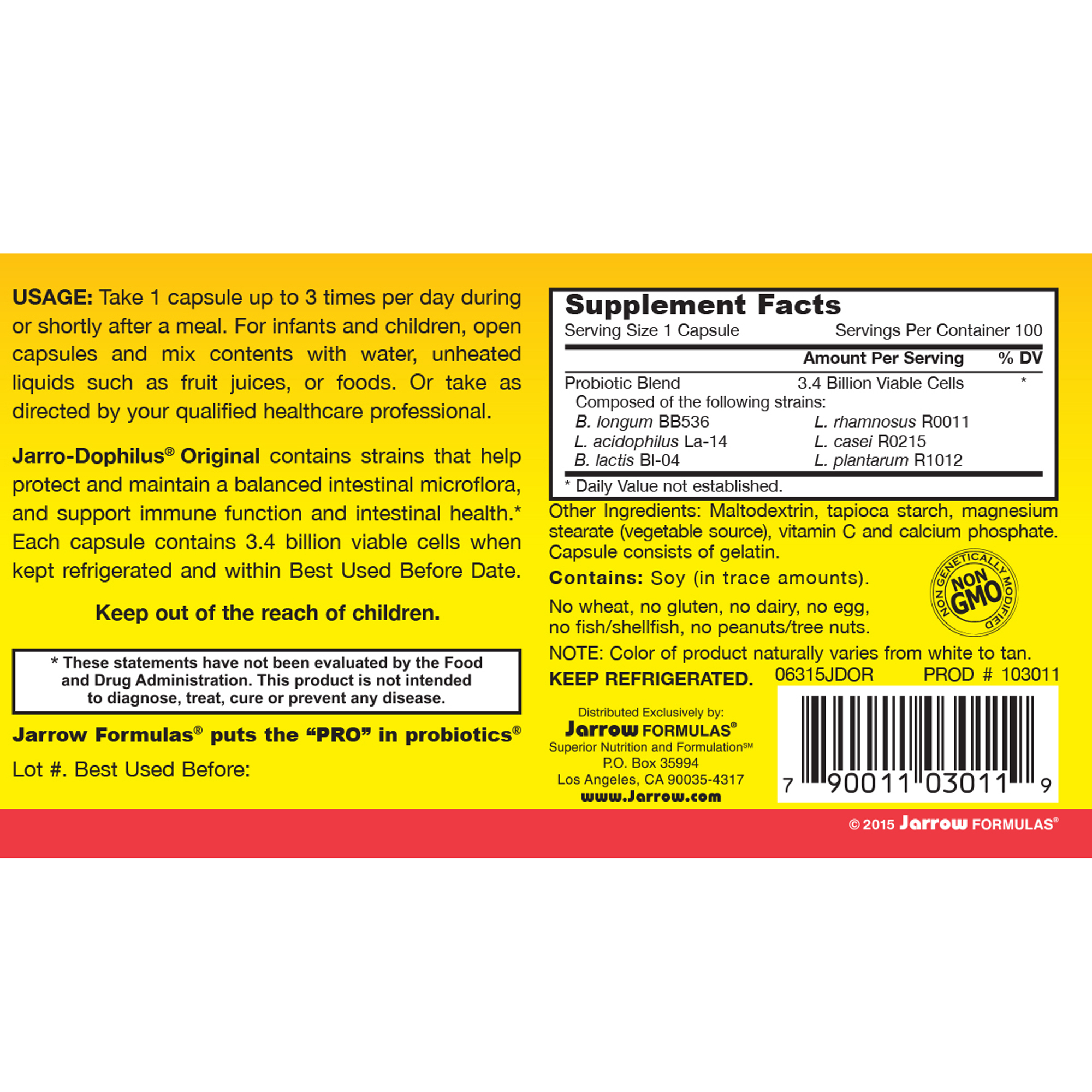 Jarro-Dophilus® Original contains strains that help protect and maintain a balanced intestinal microflora, and support immune function and intestinal health.* Each capsule contains 3.4 billion viable cells when kept refrigerated and within Best Used Before Date.