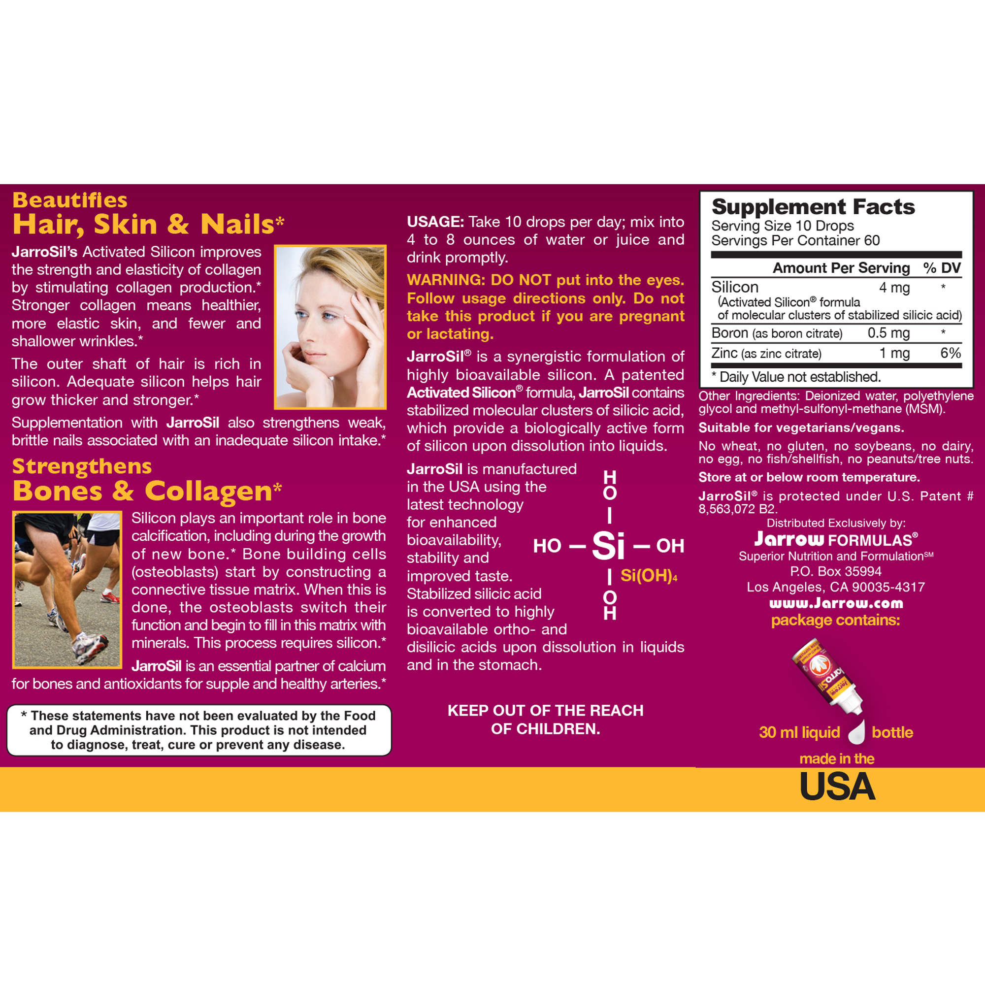 JarroSil® is a synergistic formulation of highly bioavailable silicon. A patent pending Activated Silicon® formula, JarroSil contains stabilized molecular clusters of silicic acid, which provide a biologically active form of silicon upon dissolution into liquids.