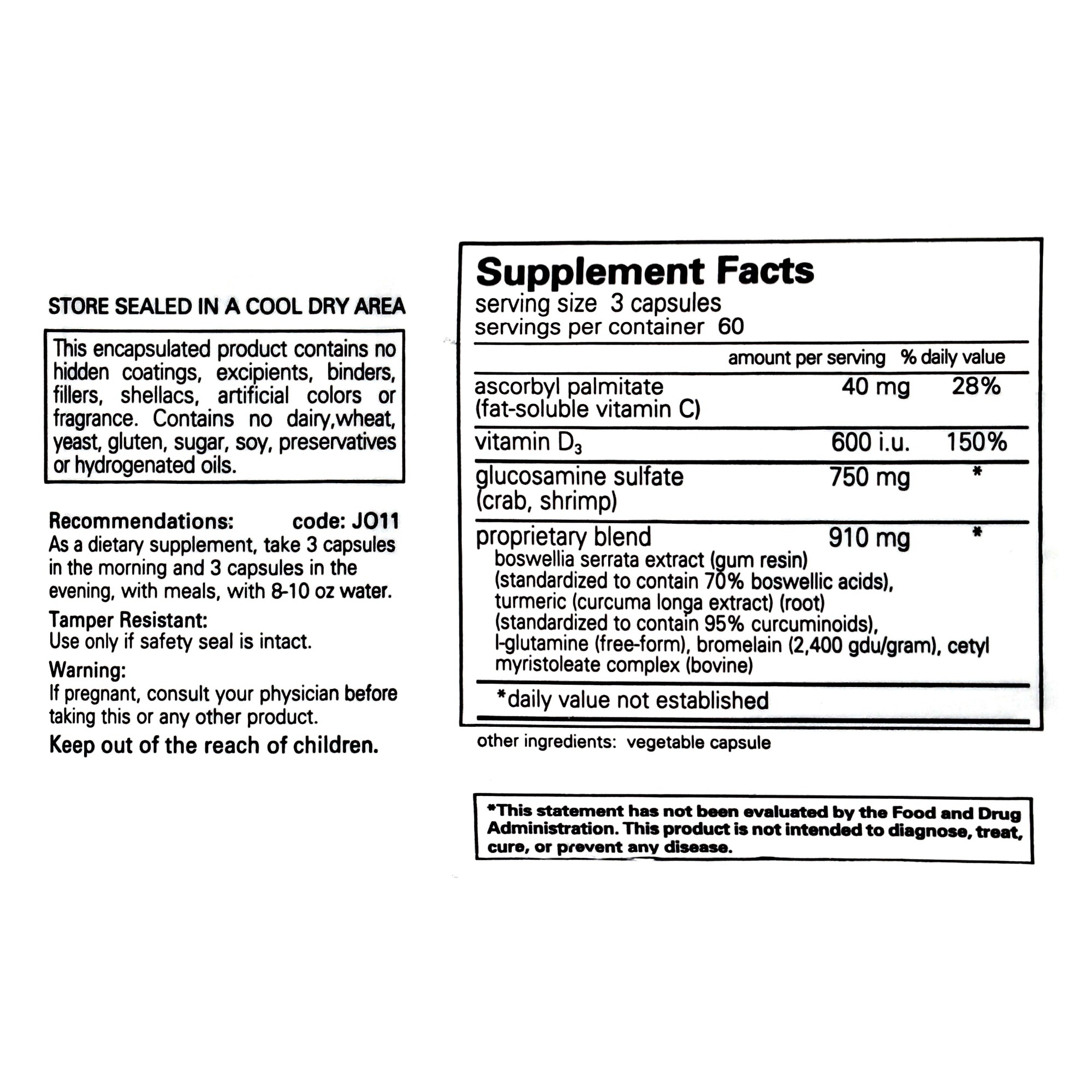 Indian frankincense (boswellia serrata) extract (gum resin) (standardized to contain 70% boswellic acids), turmeric (curcuma longa) extract (root) (standardized to contain 95% curcuminoids), l-glutamine (free-form), bromelain (2, 400 GDU/gram), cetyl myristoleate complex (bovine)