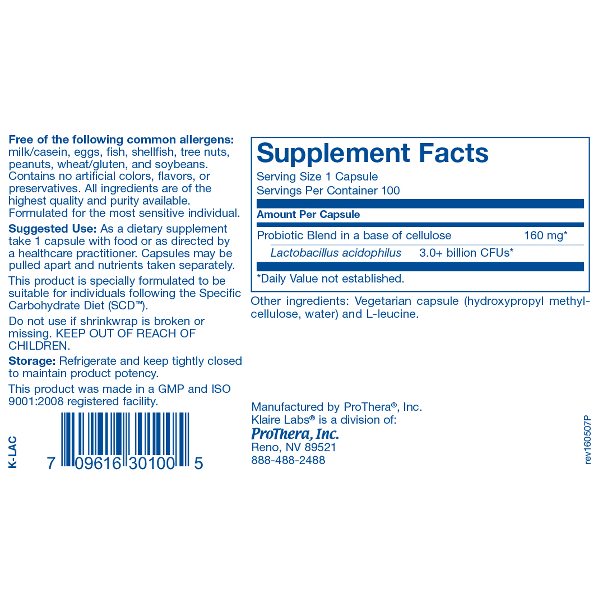 Lactobacillus acidophilus is one of the most important resident microorganisms in the small intestine. It can implant itself on the intestinal wall as well as in the lining of the wall of the vagina, cervix, and urethra, where it produces lactic and acetic acids that inhibit colonization of undesirable microorganisms. L. acidophilus also produces lactocidin, acidophilin, and other natural substances that are antagonistic to undesirable microorganisms. L. acidophilus can also aid digestion and absorption of nutrients, stabilize bowel function, and produce lactase enzyme. Klaire Labs SCD compliant L. Acidophilus formula uses the same ATCC certified strain found in our mixed probiotic formulas. This hardy microorganism is provided in a base of purified plant cellulose in a potency of 3 billion CFUs per capsule, making it suitable for individuals adhering to the Specific Carbohydrate Diet program who wish to supplement this important probiotic in support of intestinal health.