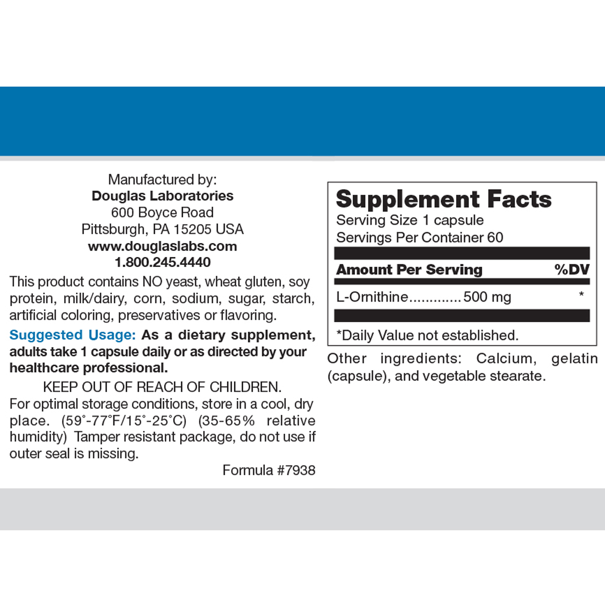 L-Ornithine, provided by Douglas Laboratories, supplies 500 mg of the amino acid in each capsule.