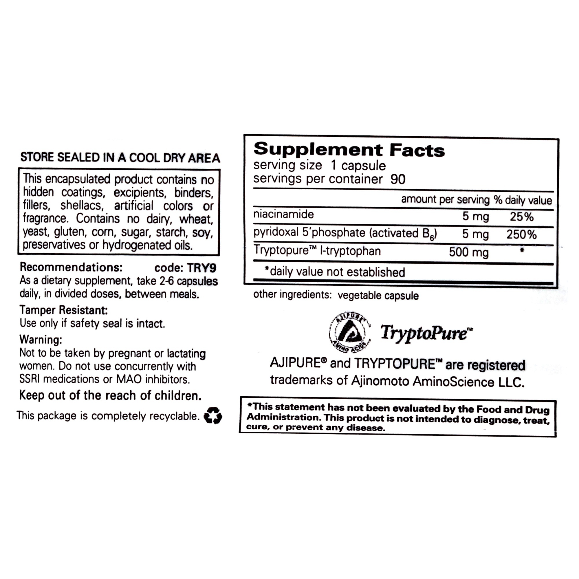 The essential amino acid l-tryptophan is a serotonin precursor. Research indicates that l-tryptophan supplementation may support emotional well-being and restful sleep. In a double blind placebo-controlled study, l-tryptophan supported healthy emotional processing and promoted positive outlook in women. In a separate study, it supported healthy mood and lessened occasional irritability during the menstrual cycle. L-Tryptophan also supports healthy sleep quality, onset and duration. Additional research suggests that tryptophan may promote relaxation and help control occasional cravings. Niacinamide and vitamin B6 provide enhanced support as important cofactors involved in the metabolism of l-tryptophan.