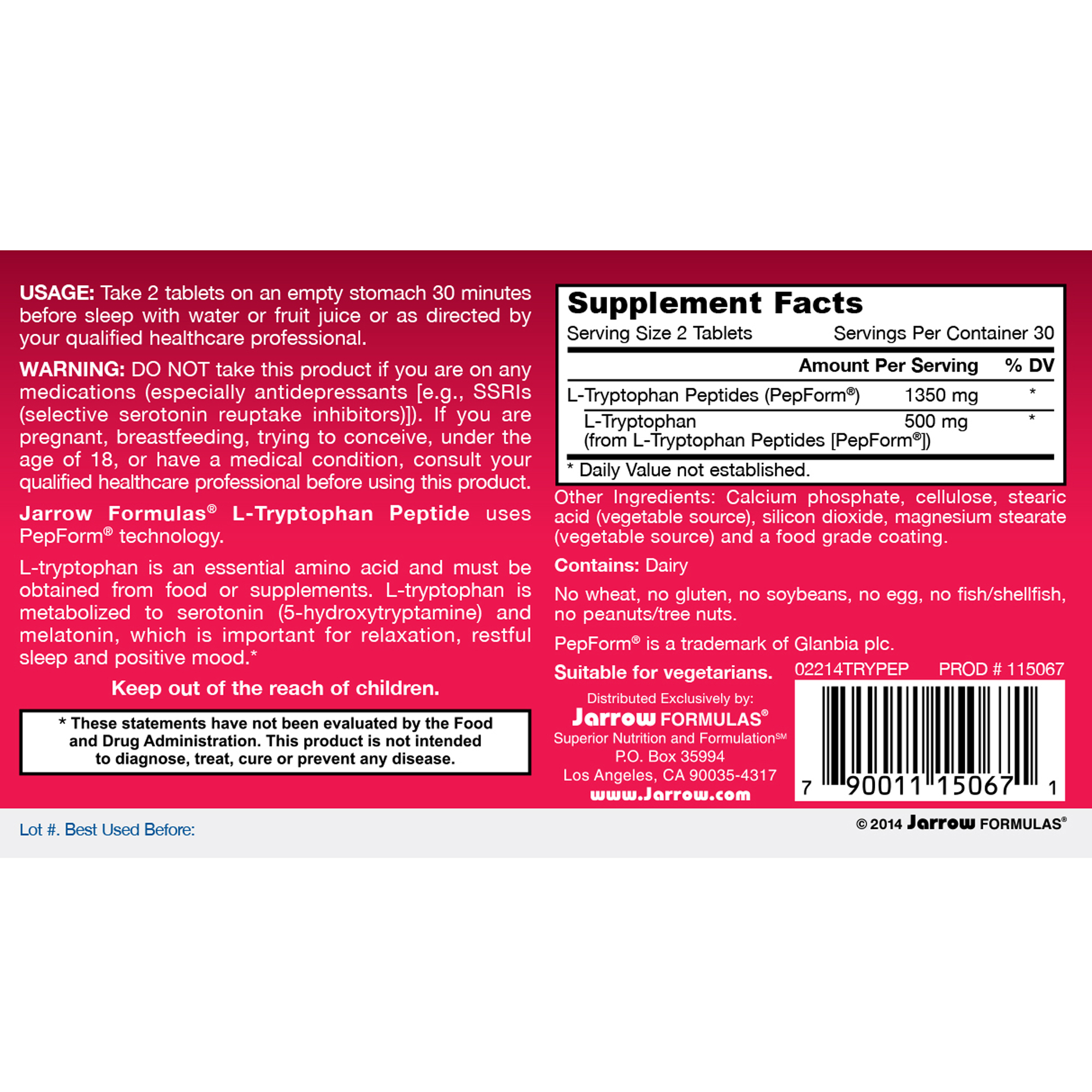 Jarrow Formulas® L-Tryptophan Peptide uses PepForm® technology.