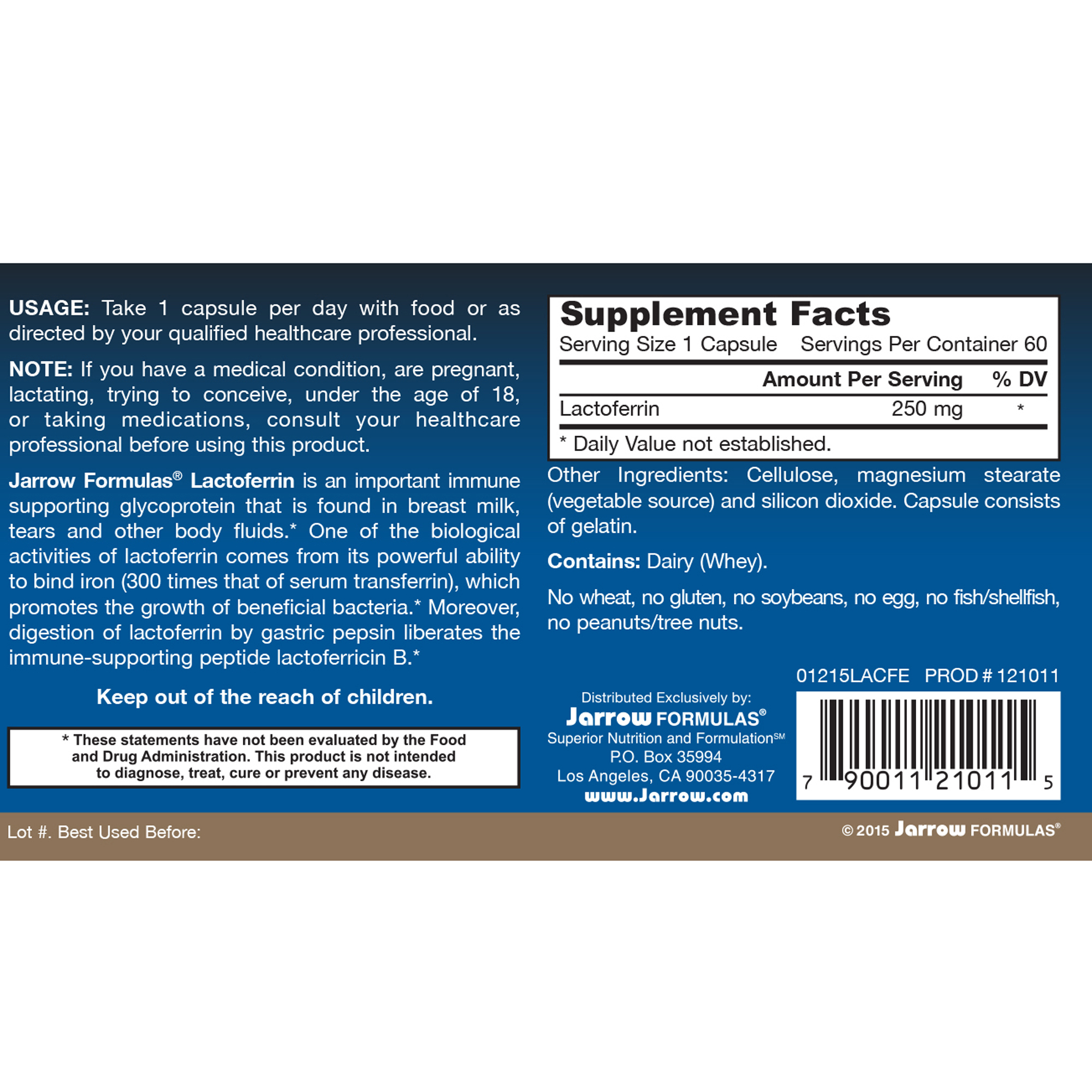 Jarrow Formulas® Lactoferrin is an important immune supporting glycoprotein that is found in breast milk, tears and other body fluids.* One of the biological activities of lactoferrin comes from its powerful ability to bind iron (300 times that of serum transferrin), which promotes the growth of beneficial bacteria.* Moreover, digestion of lactoferrin by gastric pepsin liberates the immune-supporting peptide lactoferricin B.*