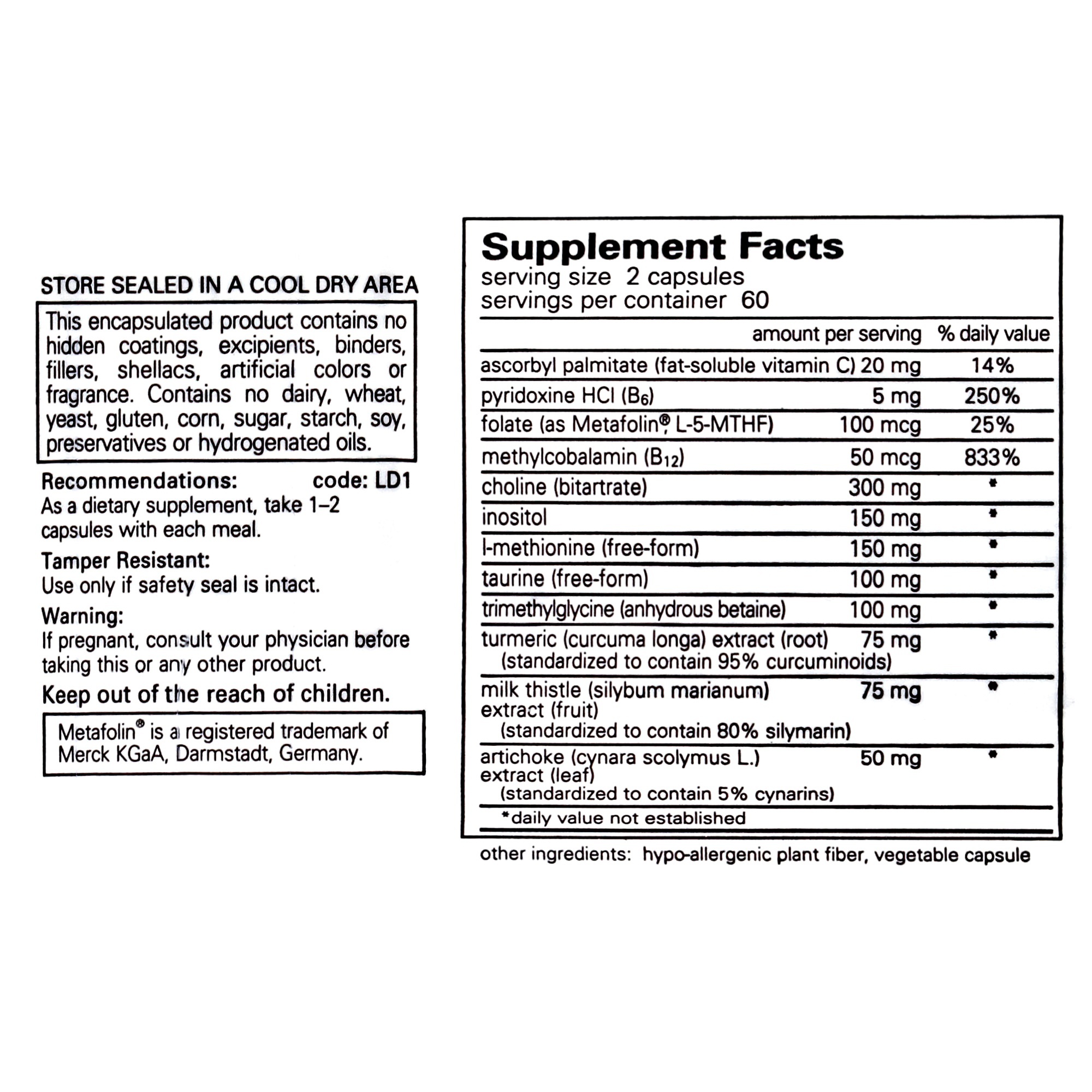 The lipotropic agents choline, betaine, methionine, vitamin B6, vitamin B12 and folic acid support healthy hepatic fat metabolism and bile flow. Efficient processing and breakdown of fats in the liver maintains healthy overall liver function and detoxification. As methyl donors, these same nutrients are also critical for methylation, a widespread biochemical process in the body that involves transferring a methyl group to another compound. Methylation of DNA supports healthy DNA integrity and stability, important for liver, colon and overall cell health. These nutritional factors are also highly recognized for their ability to maintain healthy homocysteine metabolism. Taurine, curcumin, silymarin and artichoke have been added for their abilities to support healthy bile flow, gene expression and the bodys normal toxin metabolism.