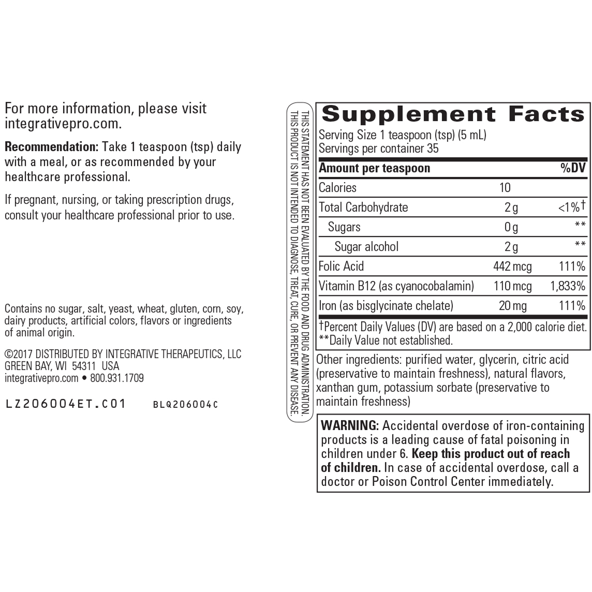 Vegetarians and women of child-bearing age may not get enough iron through diet alone. Liquid Iron is a convenient supplemental option that combines iron with vitamin B12 and folic acid. Supplementation with Liquid Iron helps form hemoglobin in red blood cells, which in turn supports energy and stamina.*