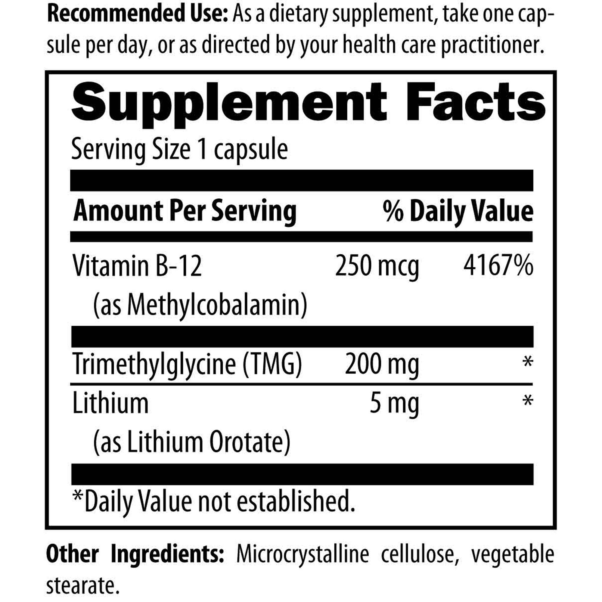 The addition of vitamin B12 and trimethylglycine (TMG) to Lithium Synergy helps support healthy methylation pathways; vitamin B12 is also needed for the synthesis of SAMe.