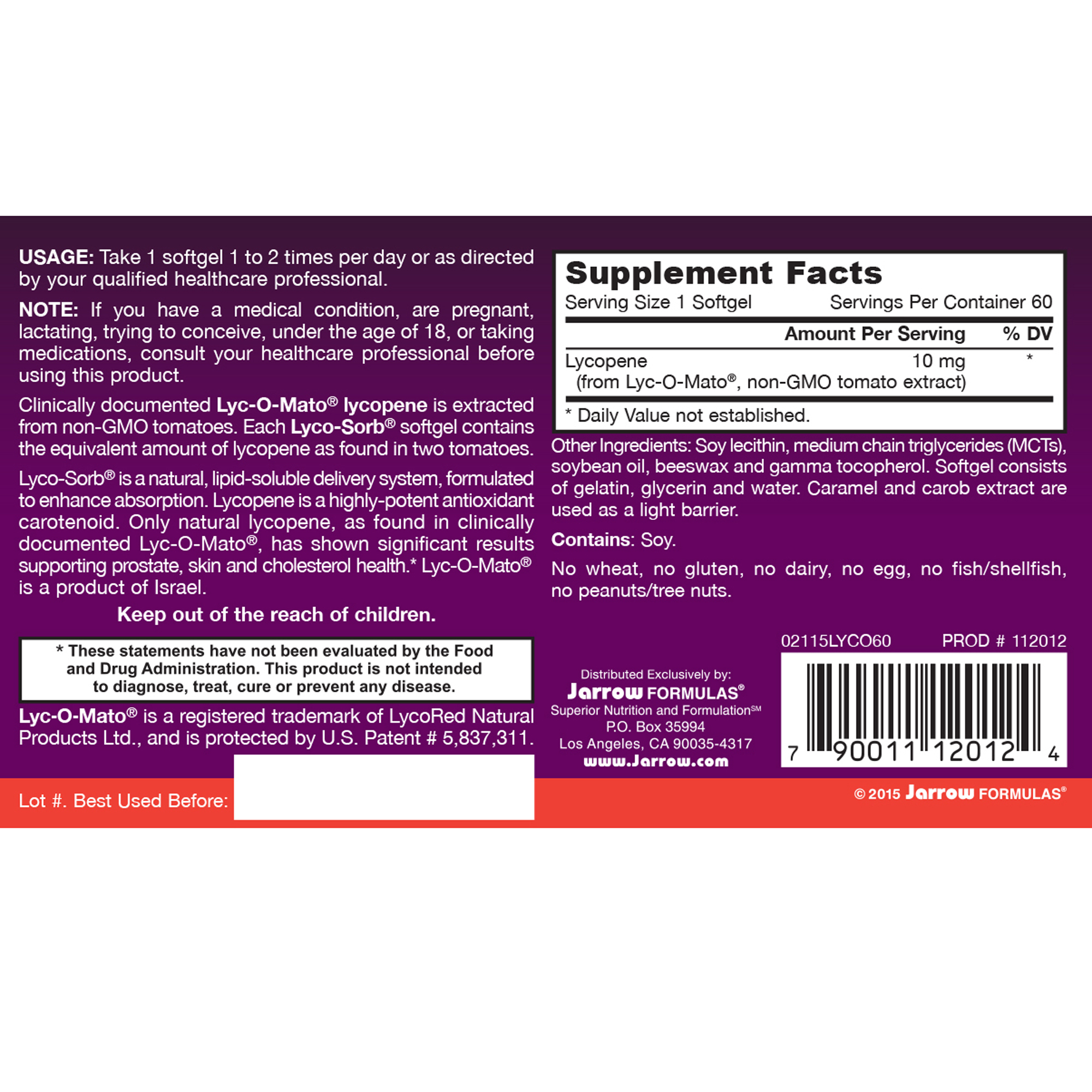 Clinically documented Lyc-O-Mato® lycopene is extracted from non-GMO tomatoes. Each Lyco-Sorb® softgel contains the equivalent amount of lycopene as found in two tomatoes.Lyco-Sorb® is a natural, lipid-soluble delivery system, formulated to enhance absorption. Lycopene is a highly potent antioxidant carotenoid. Only natural lycopene, as found in clinically documented Lyc-O-Mato®, has shown significant results supporting prostate, skin and cholesterol health.* Lyc-O-Mato® is a product of Israel.