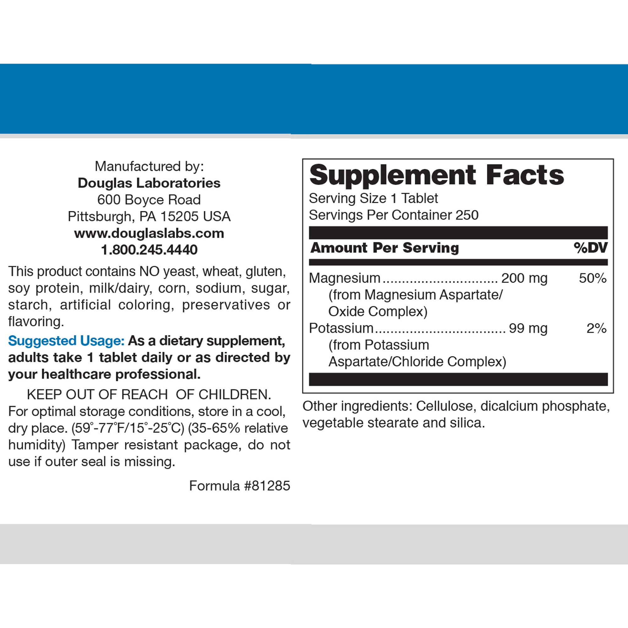 Magnesium Aspartate delivers 200 mg of elemental magnesium and 99 mg of elemental potassium per tablet in their bioavailable aspartate forms.