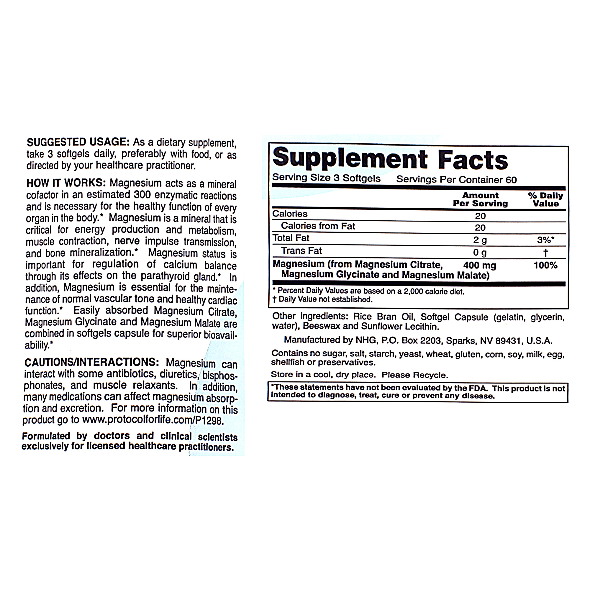 Magnesium acts as a mineral cofactor in an estimated 300 enzymatic reactions and is necessary for the healthy function of every organ in the body.* Magnesium is a mineral that is critical for energy production and metabolism, muscle contraction, nerve impulse transmission, and bone mineralization.* Magnesium status is important for regulation of calcium balance through its effects on the parathyroid gland.* In addition, Magnesium is essential for the maintenance of normal vascular tone and healthy cardiac function.* Easily absorbed Magnesium Citrate, Magnesium Glycinate and Magnesium Malate are combined in softgels capsule for superior bioavailability.*