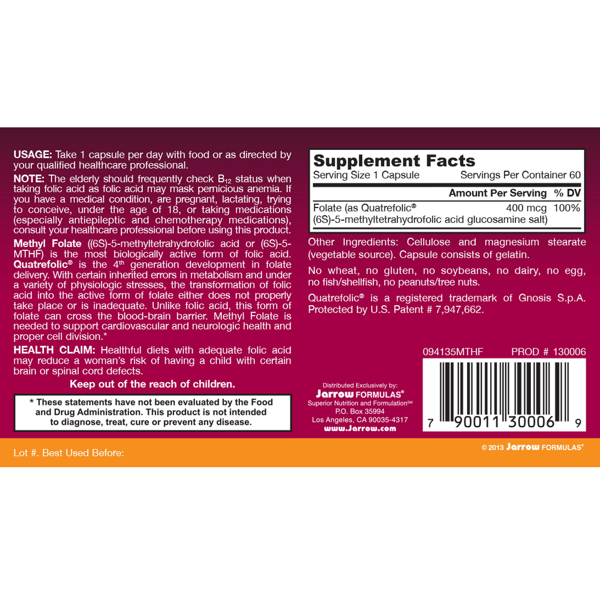 Methyl Folate ((6S)-5-methyltetrahydrofolic acid or (6S)-5-MTHF) is the most biologically active form of folic acid. Quatrefolic ® is the 4th generation development in folate delivery. With certain inherited errors in metabolism and under a variety of physiologic stresses, the transformation of folic acid into the active form of folate either does not properly take place or is inadequate. Unlike folic acid, this form of folate can cross the blood-brain barrier. Methyl Folate is needed to support cardiovascular and neurologic health and proper cell division.*