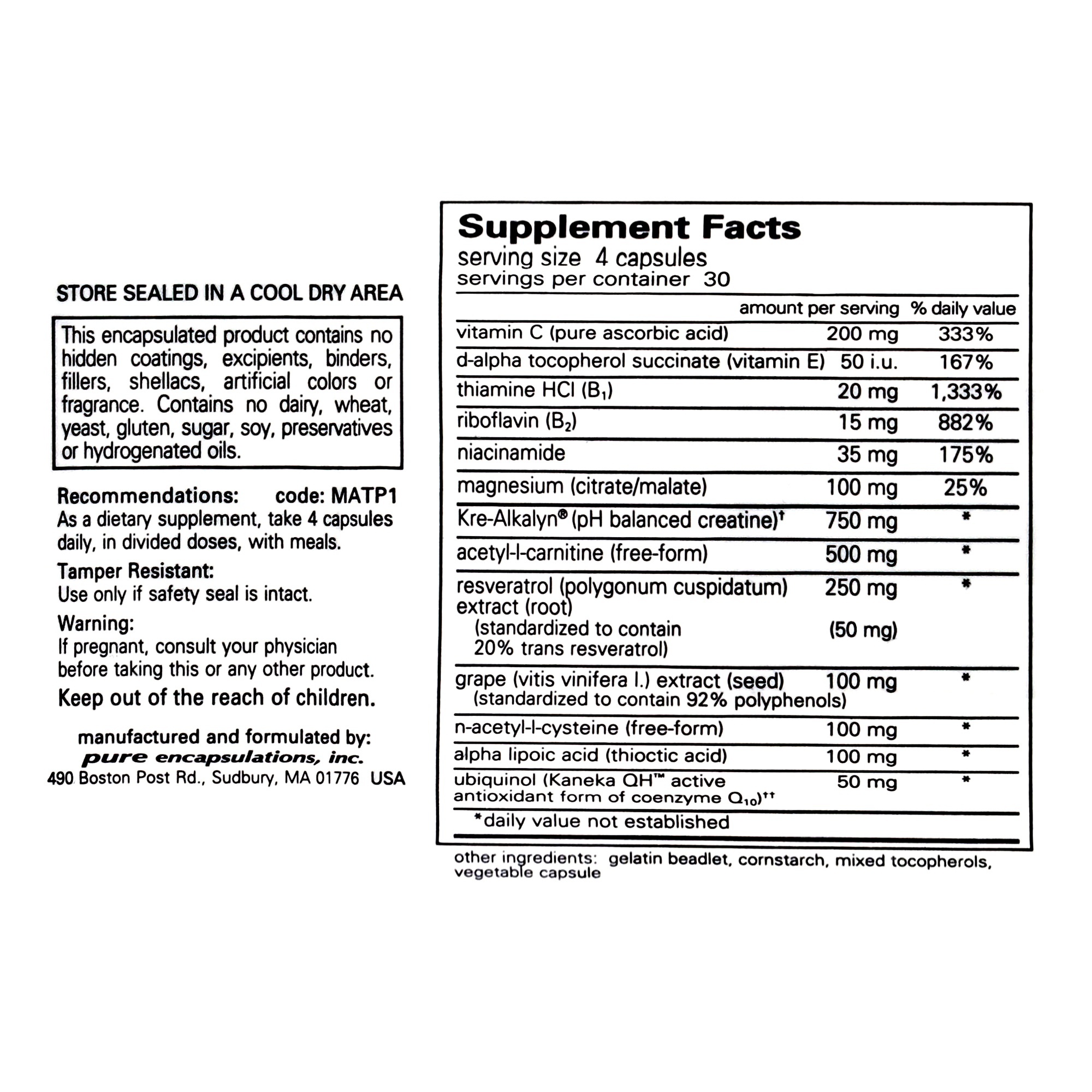 CoQ10 is a component of the mitochondria and plays a key role in the synthesis of ATP. Ubiquinol is the activated form of CoQ10 and may be especially important for individuals over 40 or for those experiencing greater levels of oxidative or physical stress. B vitamins are important cofactors needed to fuel the Krebs cycle, while optimum serum levels of magnesium are associated with healthy mitochondrial metabolism and nutrient transport. Acetyl-l-carnitine provides carnitine to transport long chain fatty acids into the mitochondria for energy as well as an acetyl group for the synthesis of the Krebs cycle precursor acetyl-CoA. Kre-Alkalyn® is a pH balanced, buffered creatine that helps to enhance ATP production and lessen muscle soreness due to lactic acid. This formula provides powerful antioxidant support from vitamins C and E, grape seed extract, resveratrol, alpha lipoic acid and n-acetyl-l-cysteine. These nutrients neutralize the free radicals generated during energy production in the mitochondria. In a double blind, placebo-controlled crossover study, the combination of creatine, CoQ10, and alpha lipoic acid supported energy production and antioxidant status within the mitochondria.